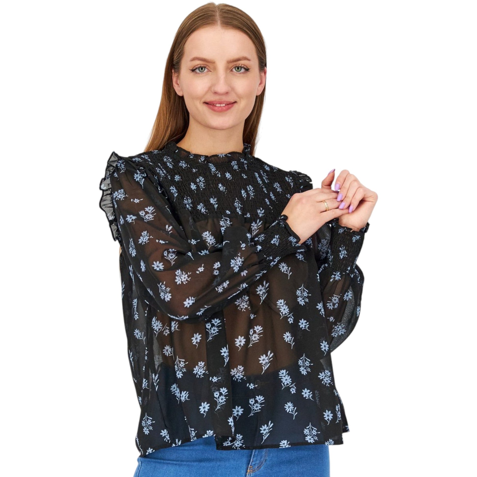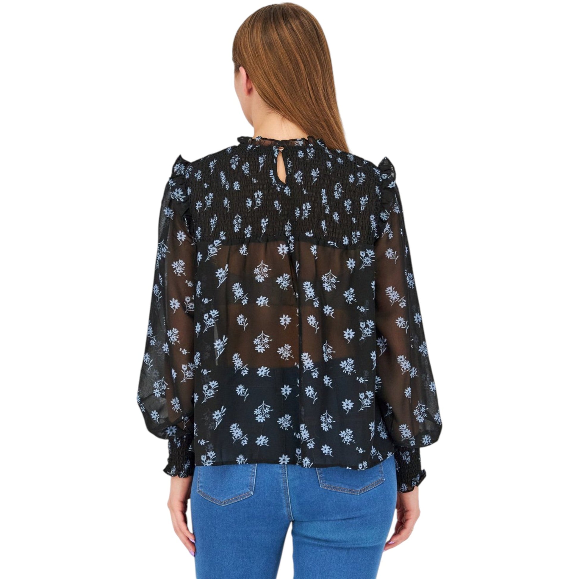 Címke nélküli, fekete, áttetsző, hosszú puffos ujjú (gumírozott mandzsetta), magas, fodros nyakú, felső részen és a mandzsettán gumírozott (smocked) anyagú, fehér/kék virágmintás.