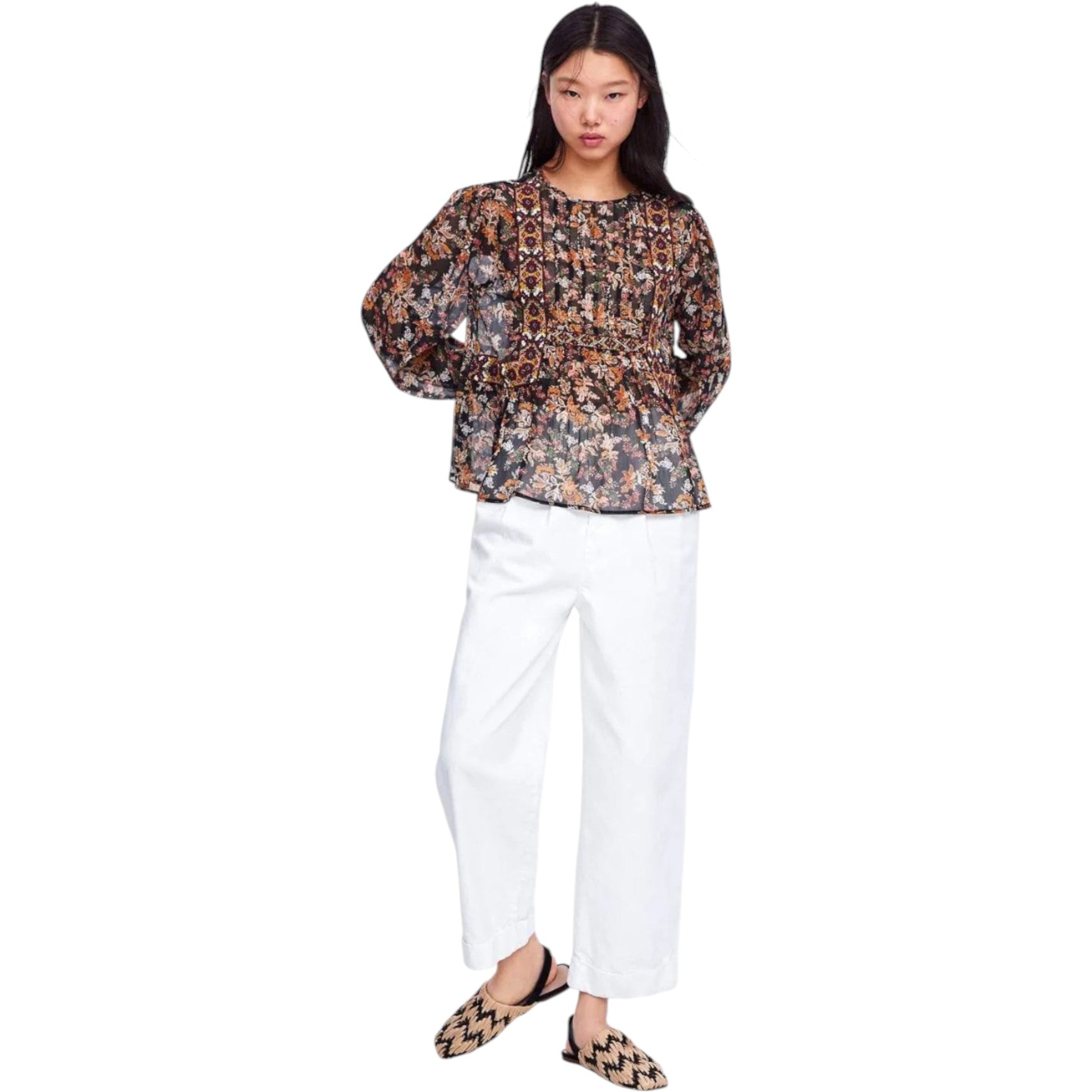 Címke nélküli, fekete alapon többszínű (narancs, zöld, bézs) virágmintás, hosszú ujjú, peplum szabású blúz, kerek nyakkivágással, fodros gallérral és mellrésznél ráncolt szűkítéssel.