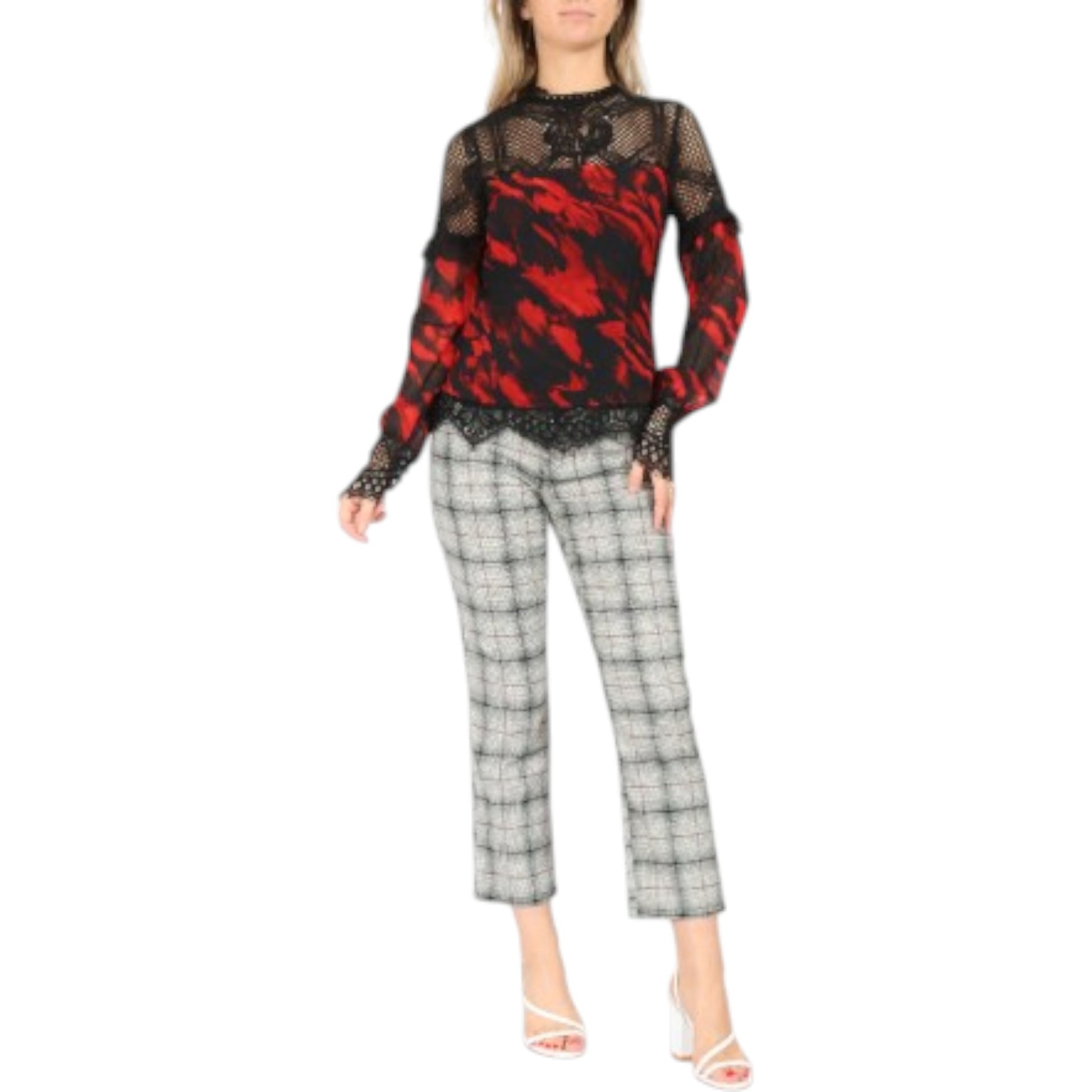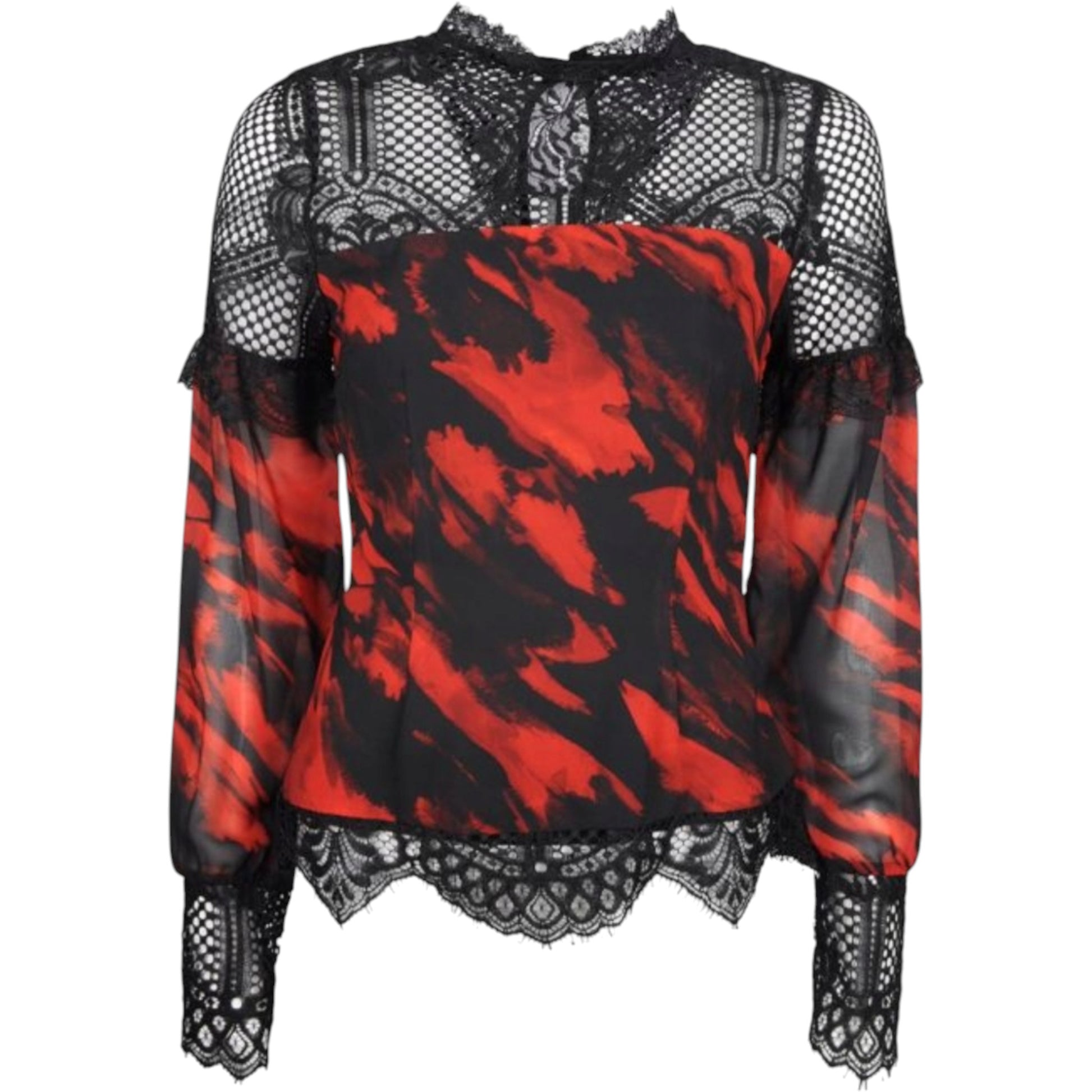 Címke nélküli, fekete és piros mintás, átlátszó anyagú, hosszú ujjú blúz, csipkés, magas (garbó jellegű) gallérral és csipkés felső résszel, valamint csipkés ujjvégekkel és aljjal. A piros szín fekete foltokkal van mintázva.