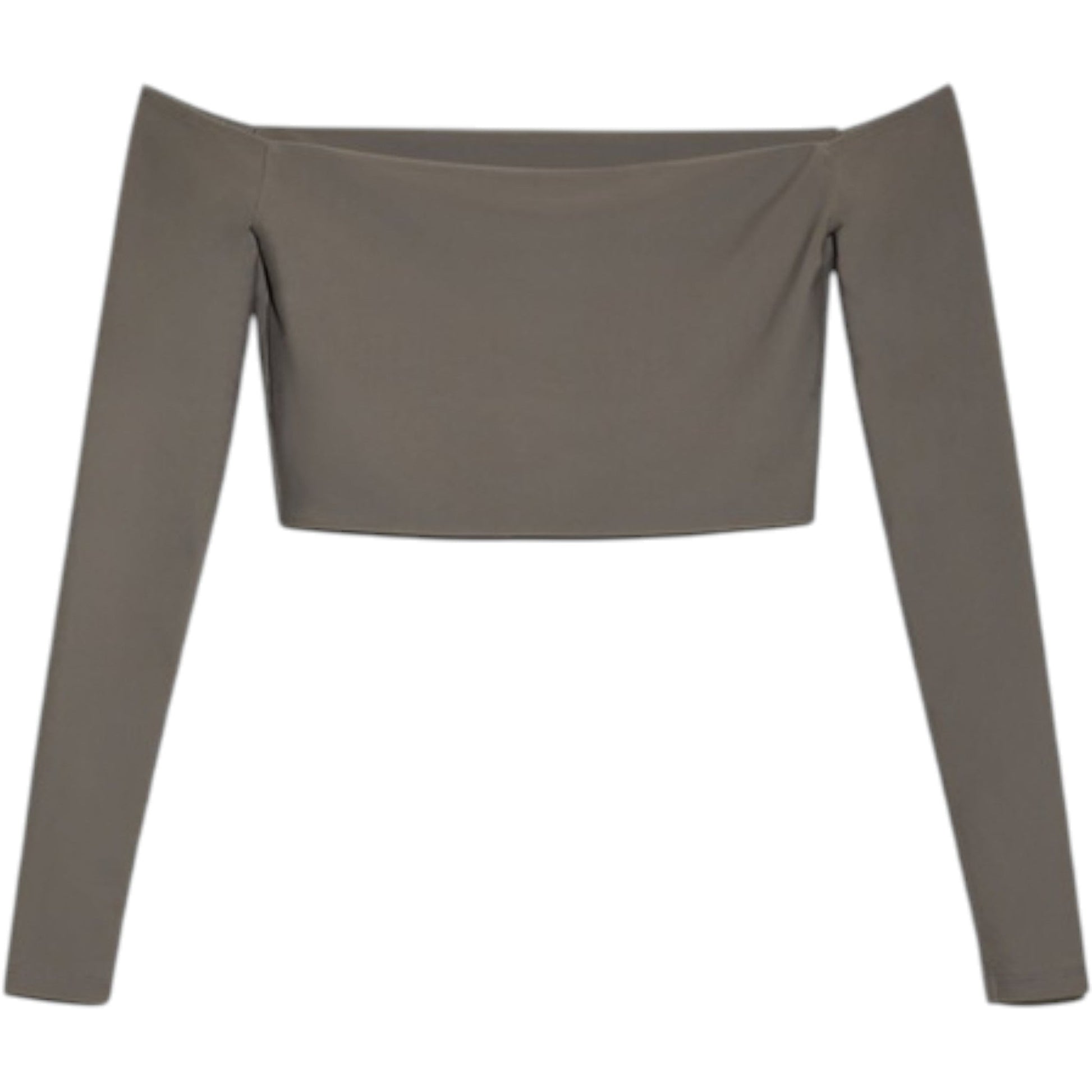 Címke nélküli, taupe (szürkésbarna) színű, hosszú ujjú, váll nélküli (off-shoulder) crop top, egyenes nyakkivágással.
