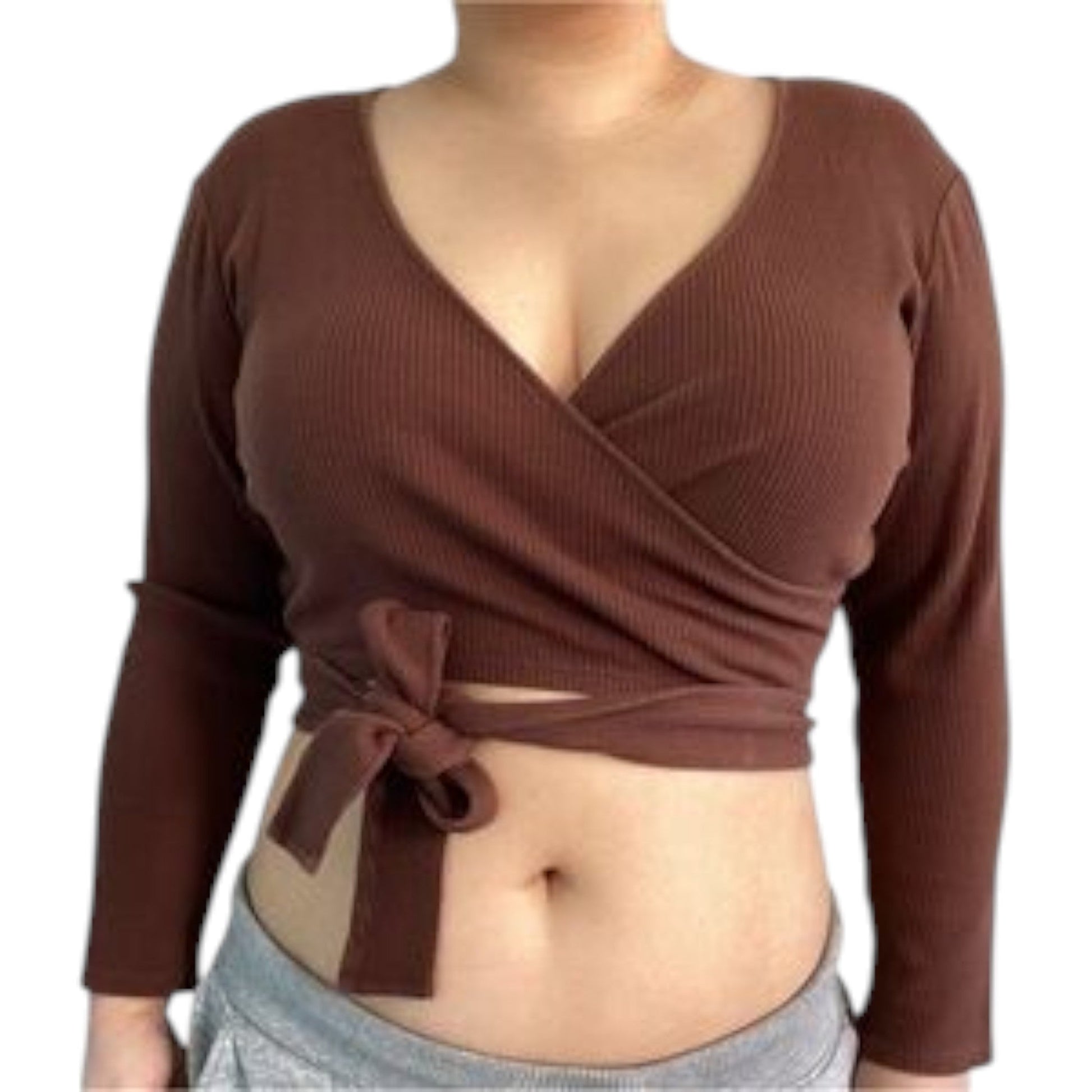 Címke nélküli, barna színű, bordázott kötött anyagú, hosszú ujjú, V-nyakú, átlapolt (wrap) pulóver/felső, deréknál megkötős záródással.