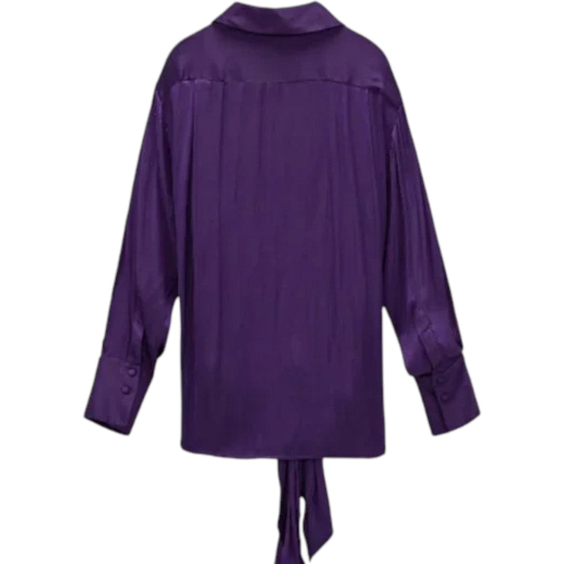 Címke nélküli, lila színű selyem/szatén hatású, hosszú ujjú ing, gallérral és gombos mandzsettával. Az ing hátsó része látható, alul megkötő pántokkal.