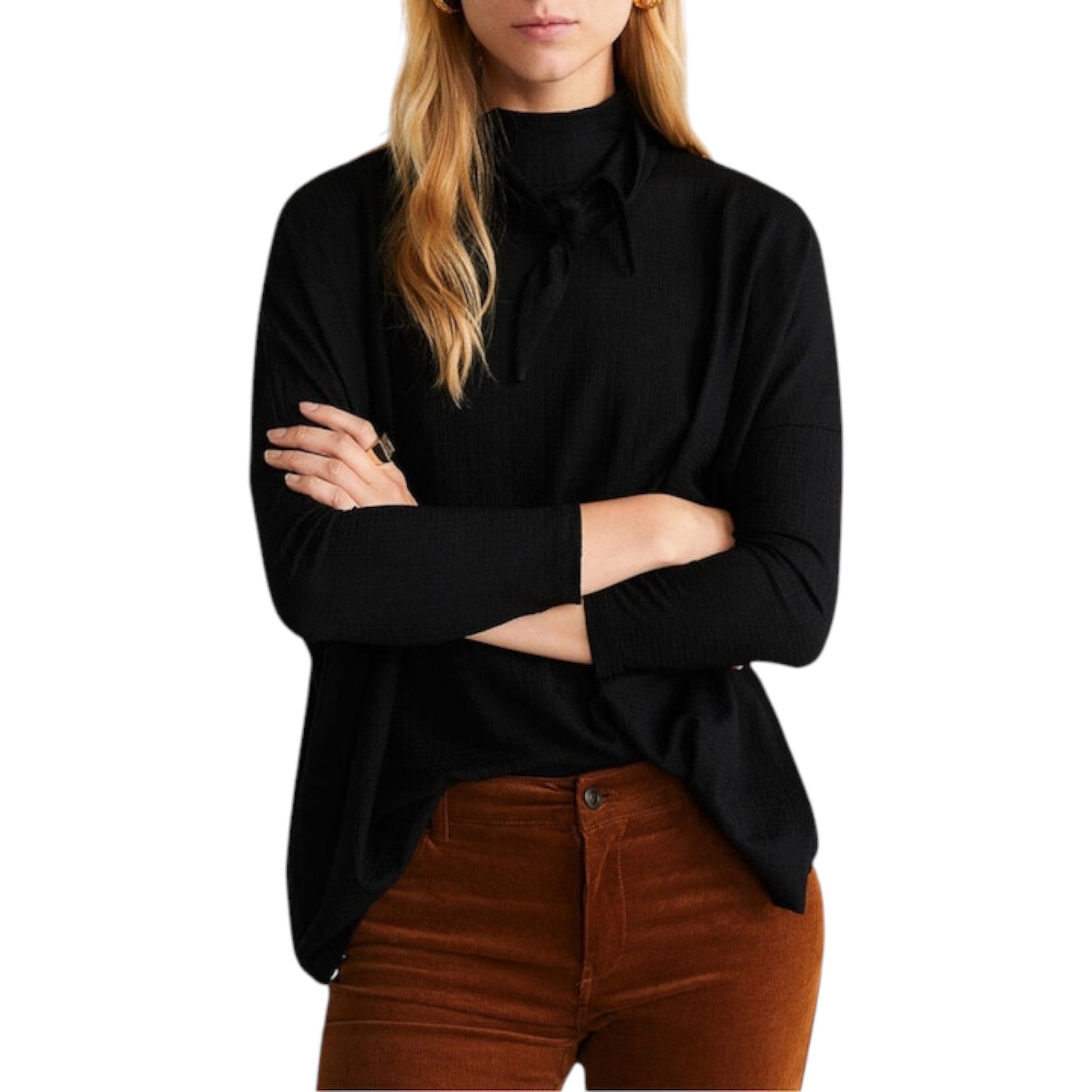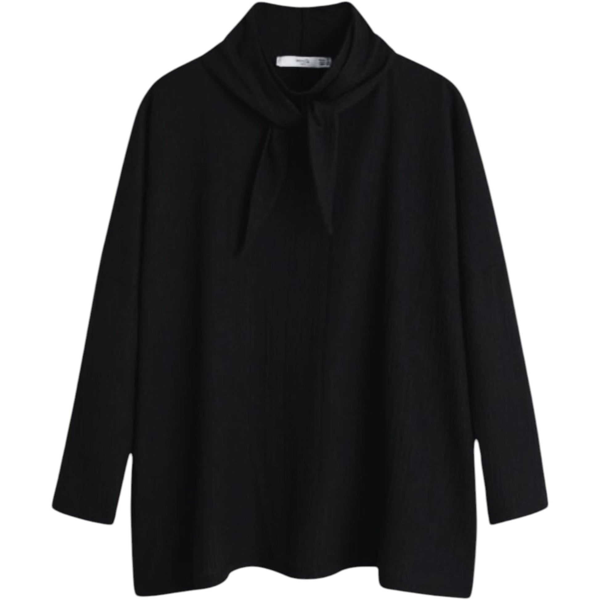 Címke nélküli, fekete, hosszú ujjú, kötött/bordázott anyagú, laza esésű, garbó nyakú / nyaknál masnira köthető hosszú ujjú felső.