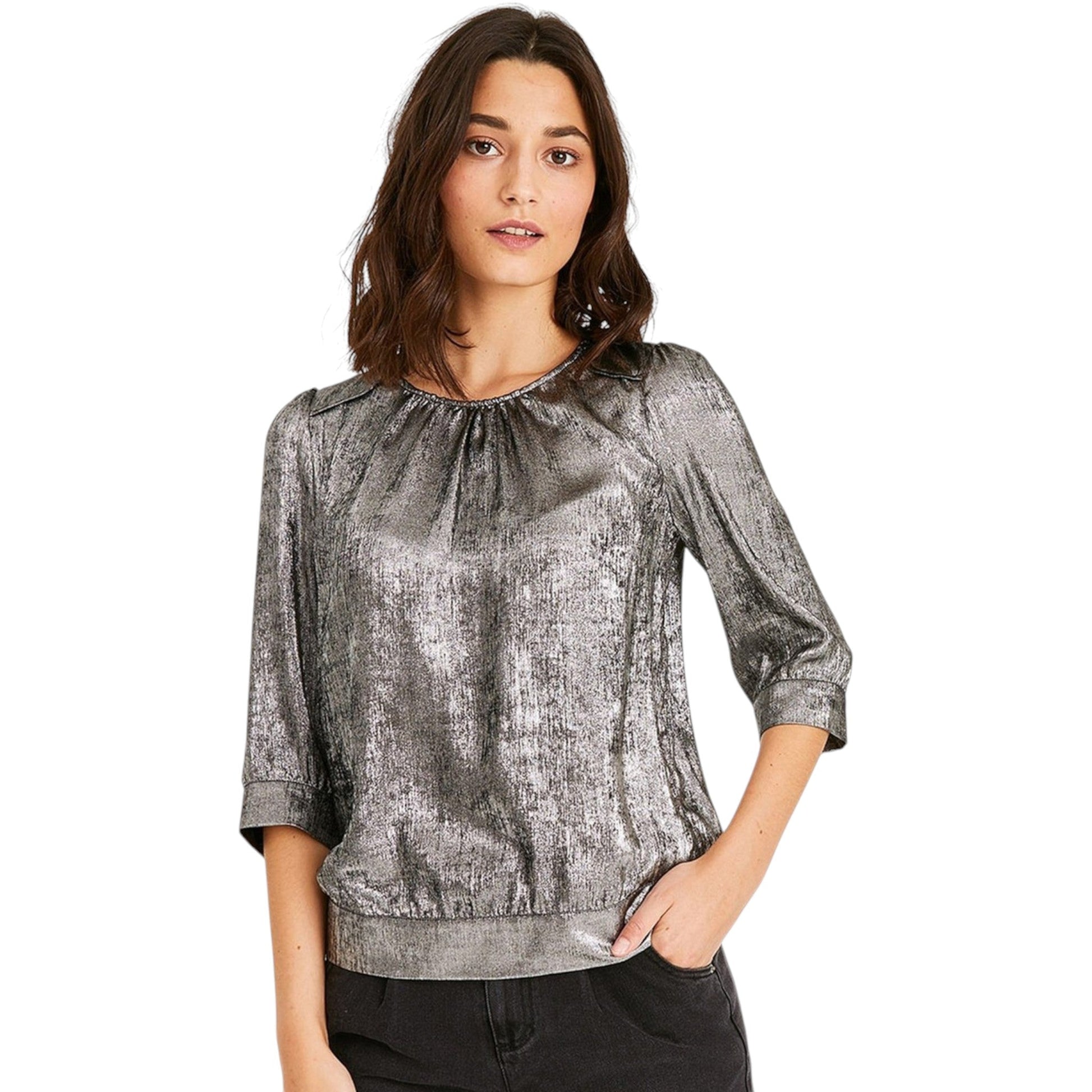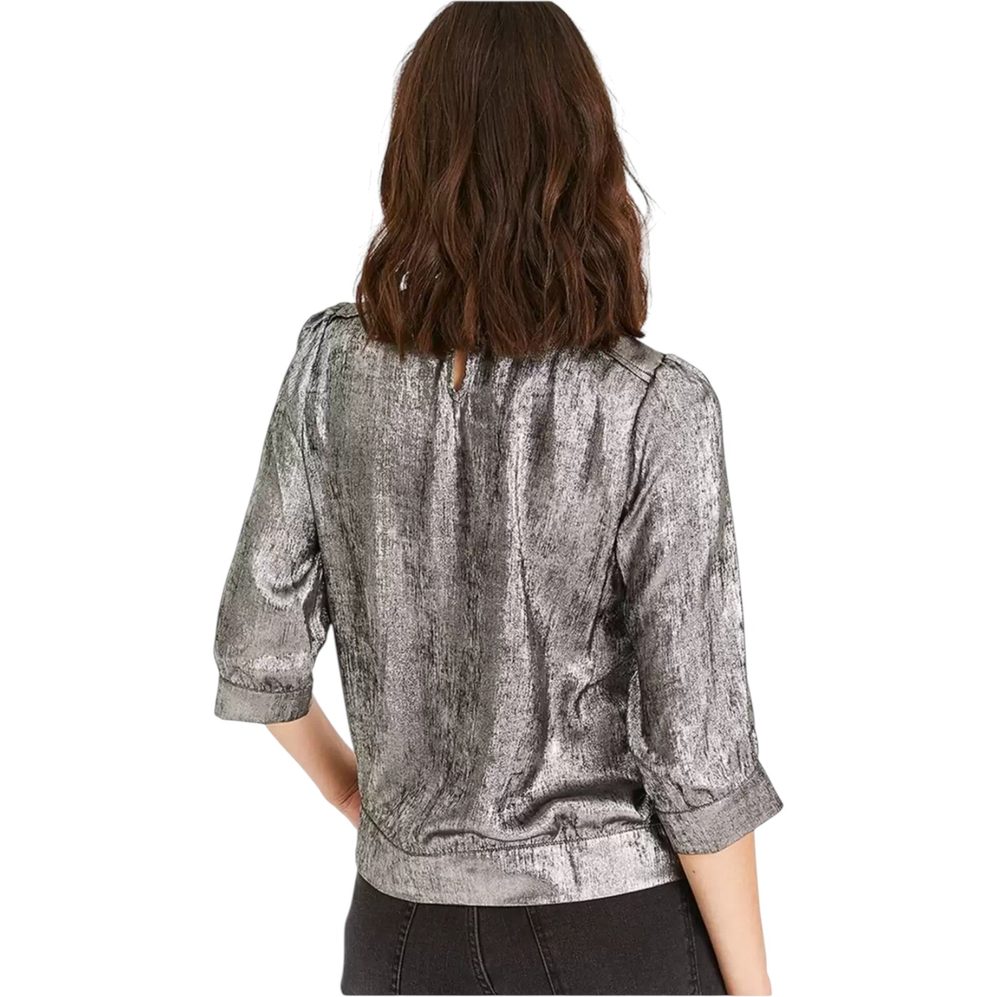 Címke nélküli, ezüstszínű, fényes hatású, kerek nyakú blúz. A hátulján csepp alakú kivágás gombos záródással. 3/4-es ujjú. Az alja és az ujjvégek gumírozottak.
