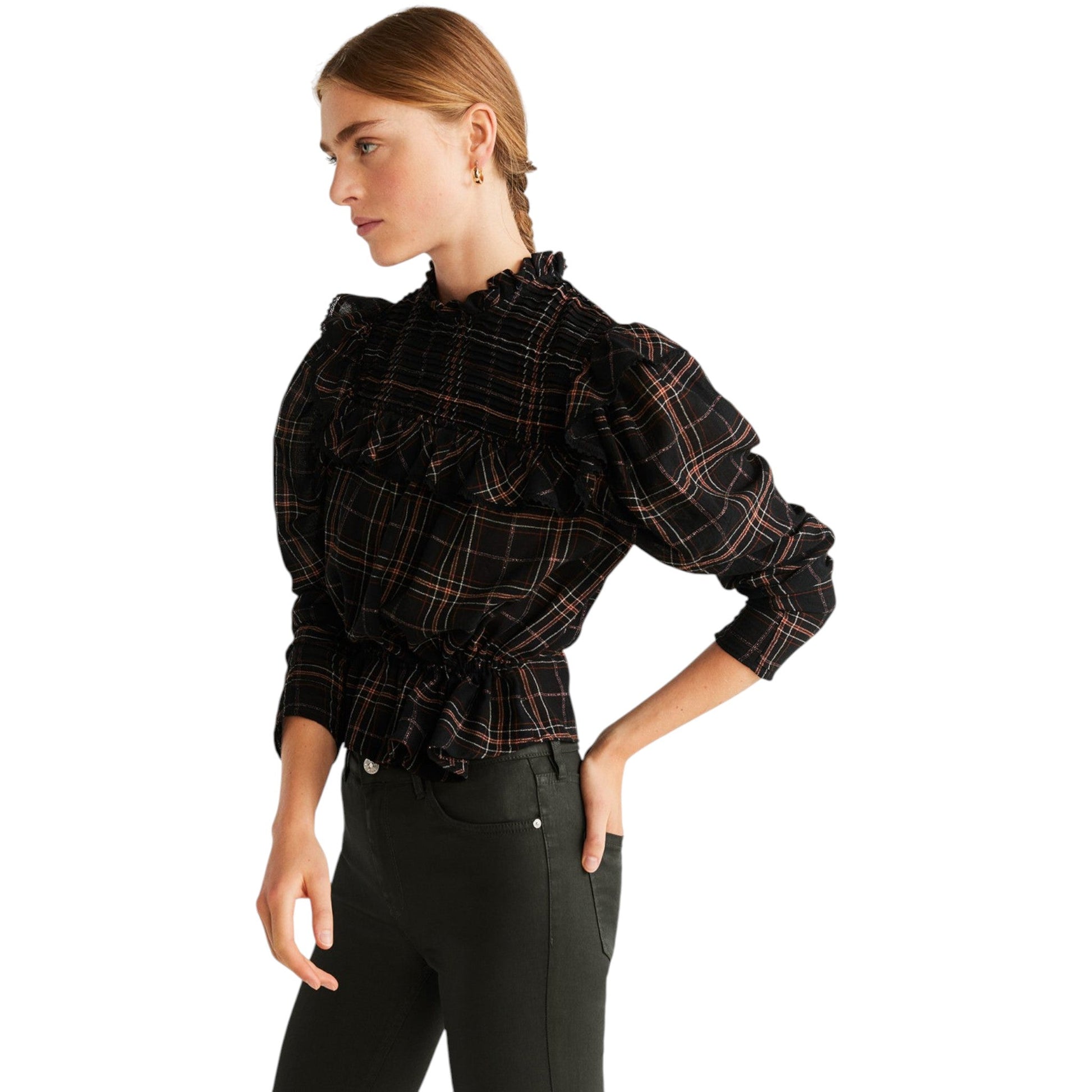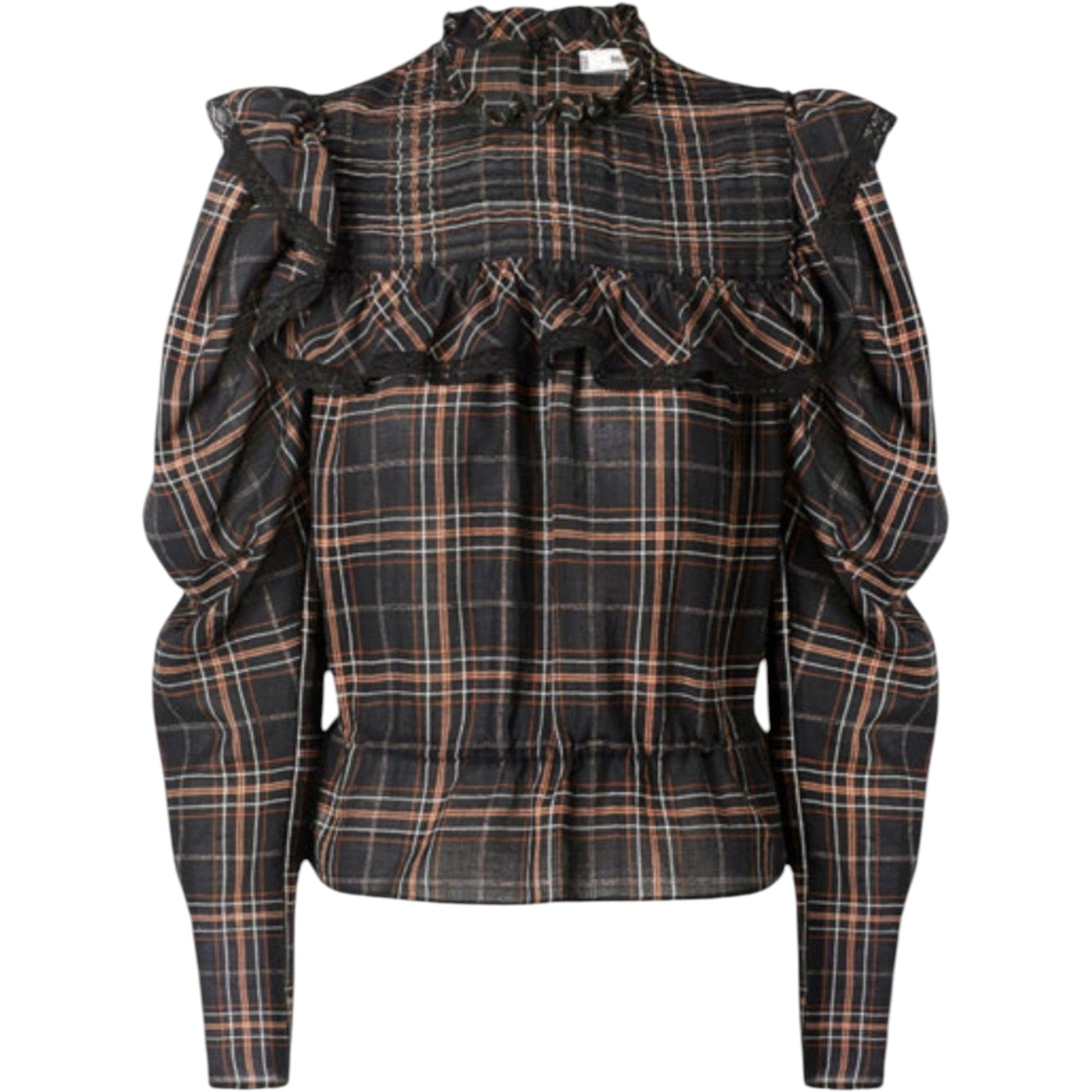 Címke nélküli, fekete alapon piros, barna és fehér kockás mintás, magas, ráncolt nyakú blúz. Fodros díszítéssel a vállakon és a mellrésznél. Az ujjak ráncoltak, puffos hatásúak. A dereka gumírozott.