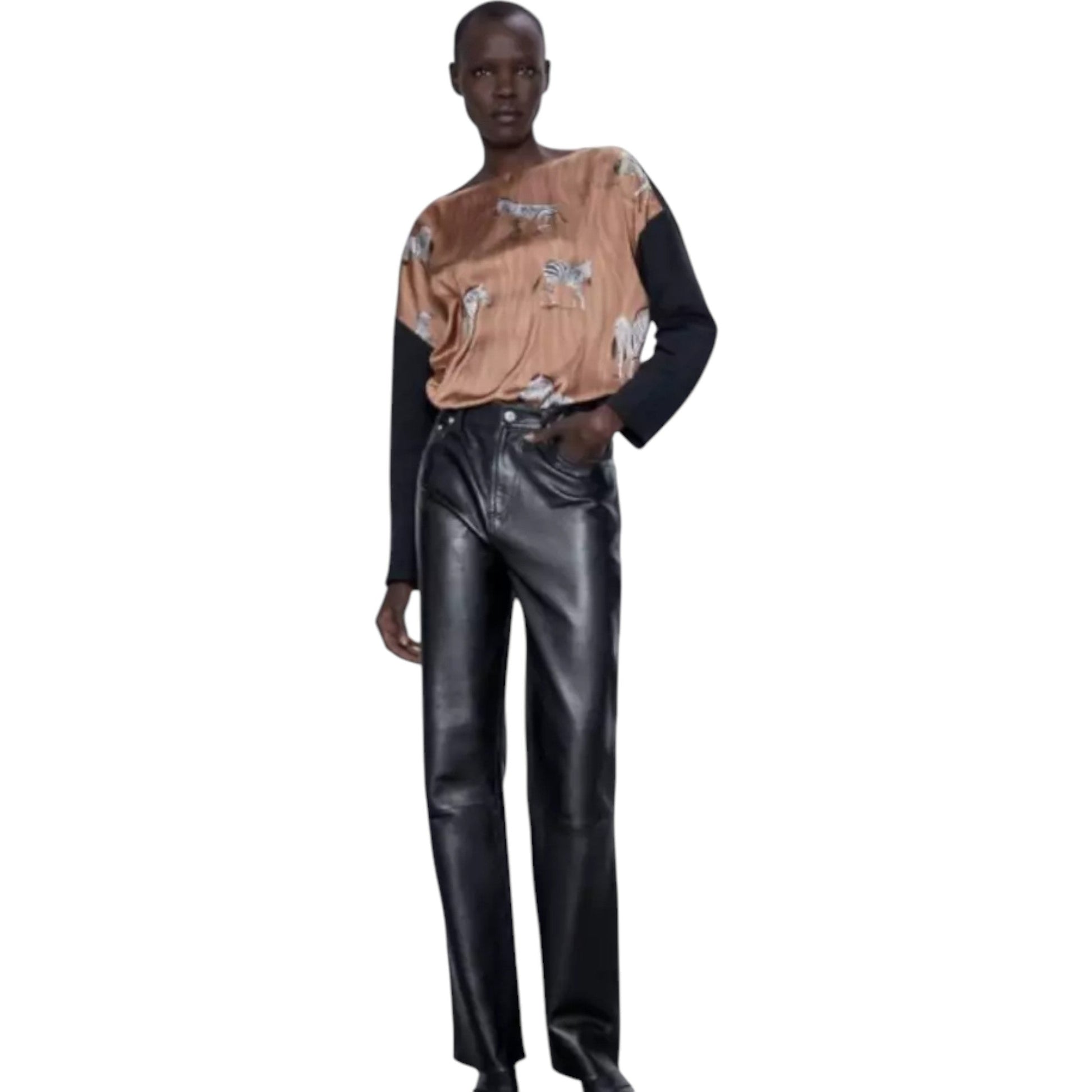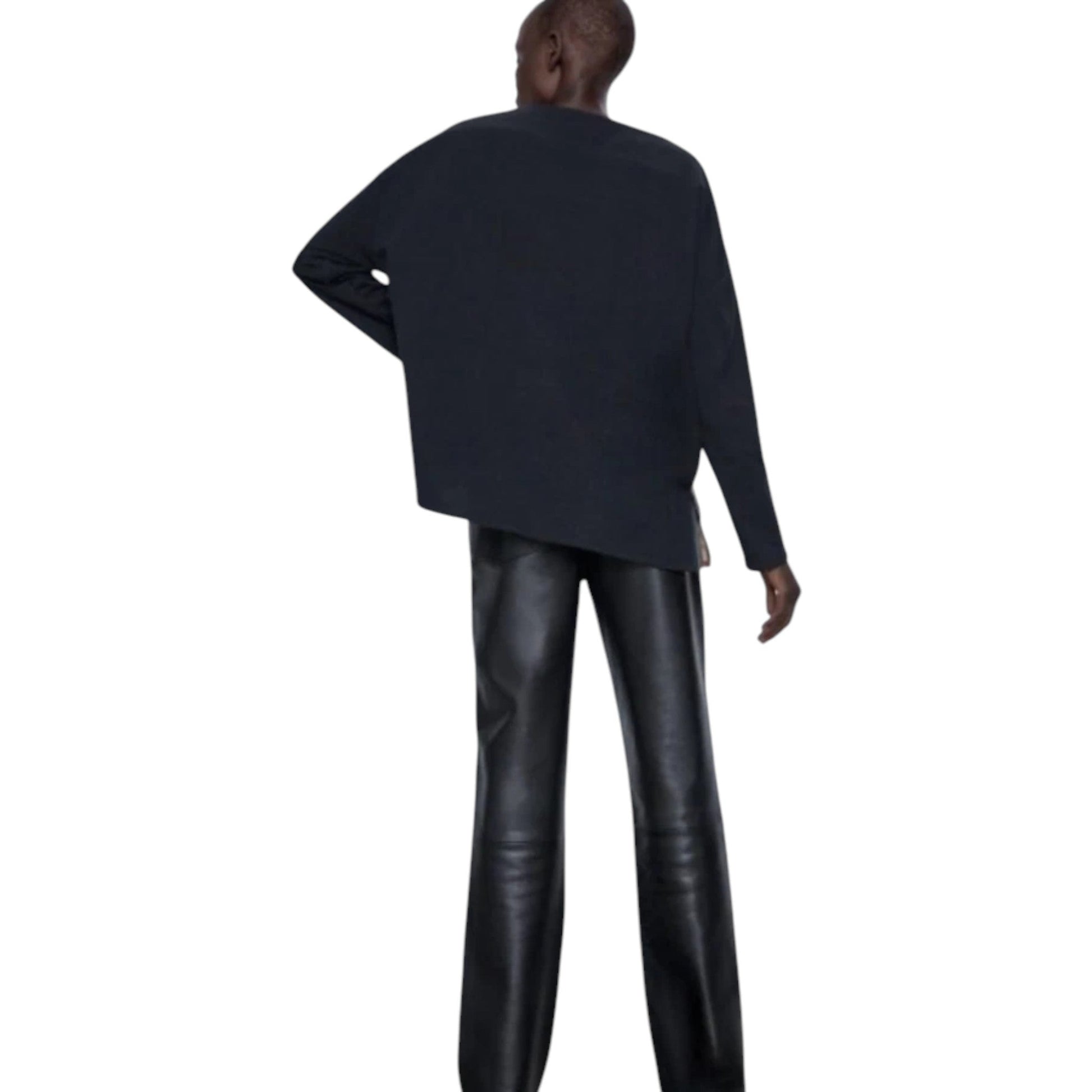 Címke nélküli, egyszínű fekete pulóver. Ejtett vállú, bővebb szabású, hosszú ujjú. Az alja aszimmetrikus lehet. (Megjegyzés: Ez a felső hátsó nézetben látható a barna, zebra mintás felső háta is lehet).