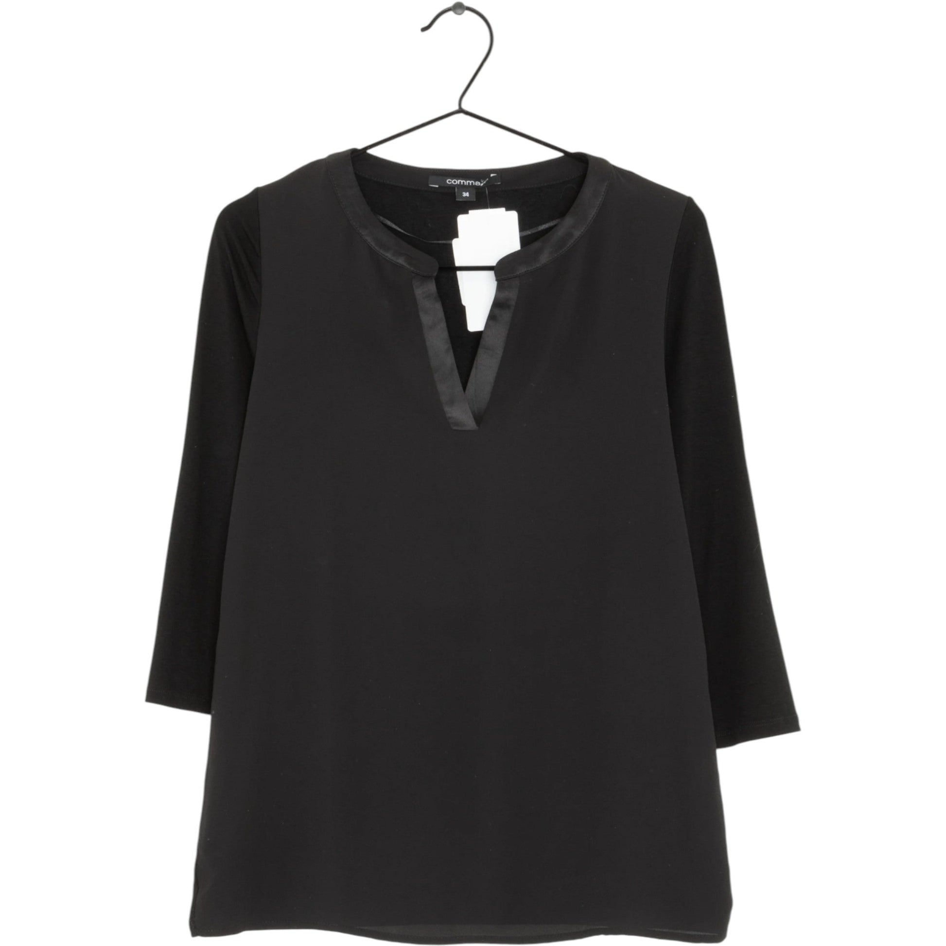 Címke nélküli, egyszínű fekete, 3/4-es ujjú tunika. V-nyakú, a nyakkivágás fekete, szatén hatású szegéllyel van díszítve. Bő, egyenes szabású, a felső része anyagszabása eltér a blúz részétől.