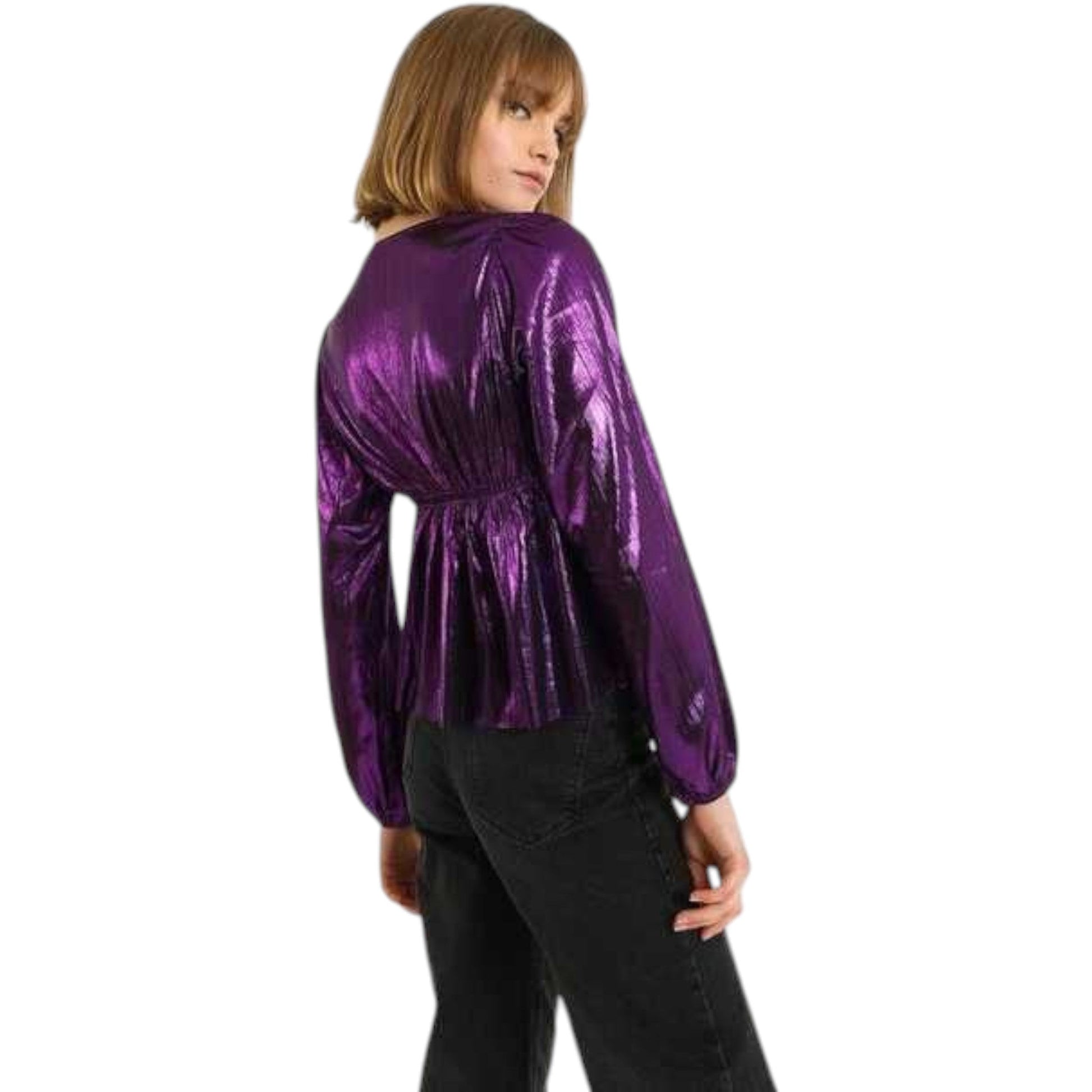 Címke nélküli, lila, fémes fényű anyagú, átlapolt V-nyakú blúz. A mellrésznél és a derekánál gumírozott, az alja fodros (peplum) szabású. Hosszú ujjú, az ujjvégek gumírozottak.