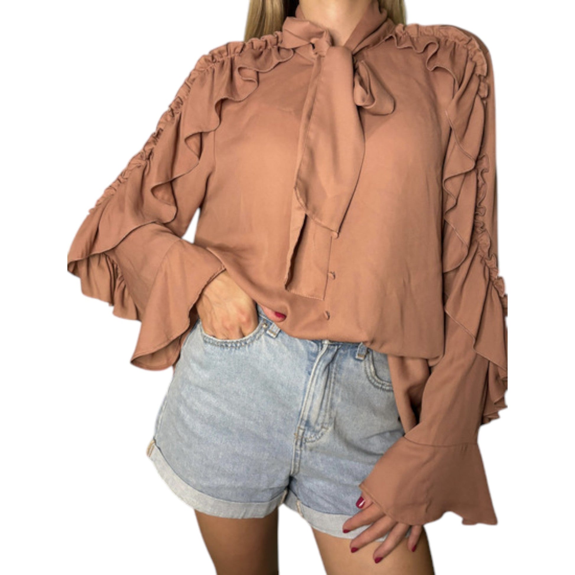 Címke nélküli, barnás-rózsaszín (púder) színű, hosszú ujjú blúz. Masnira köthető gallérral. Az ujjak fodros díszítésűek. Peplum hatású aljjal.