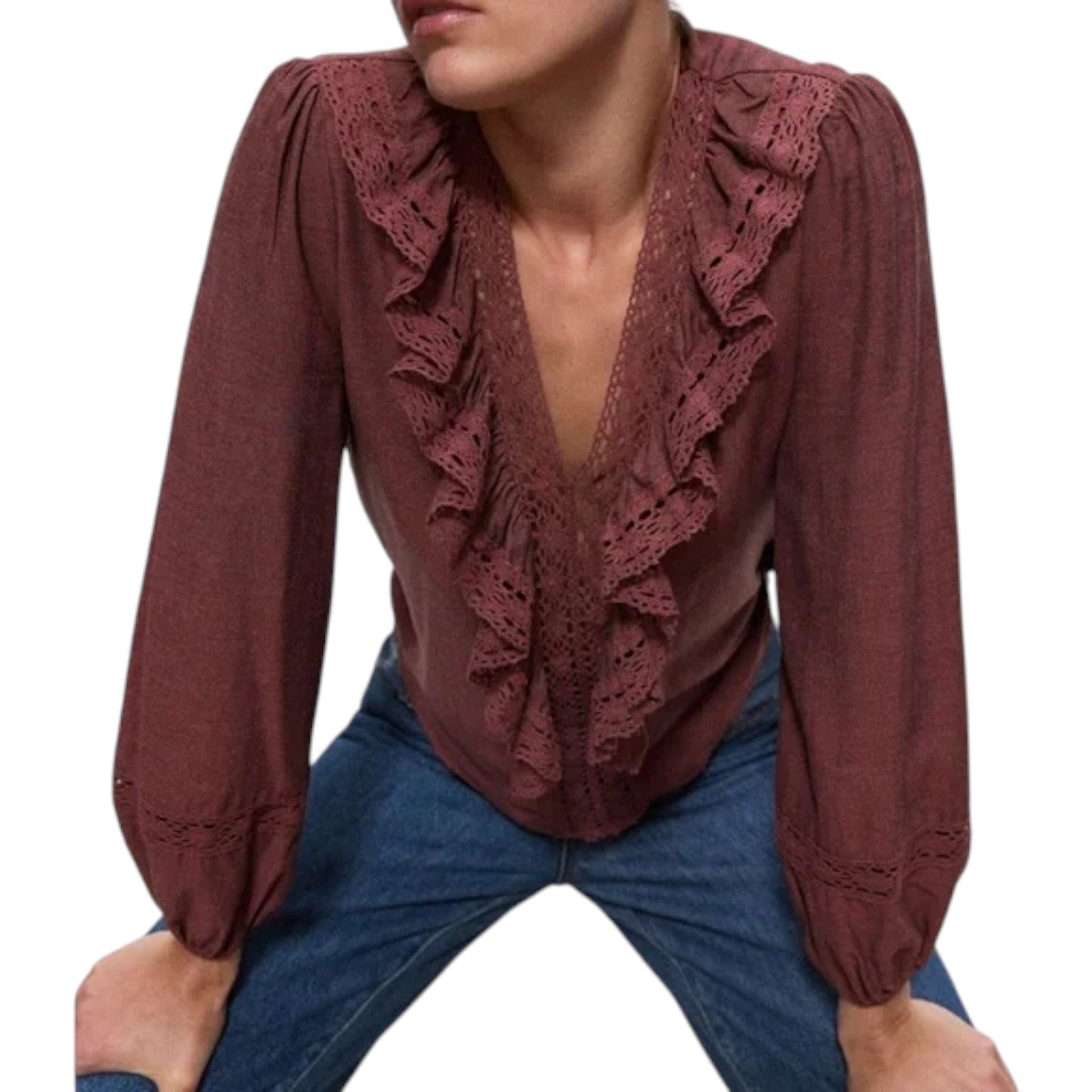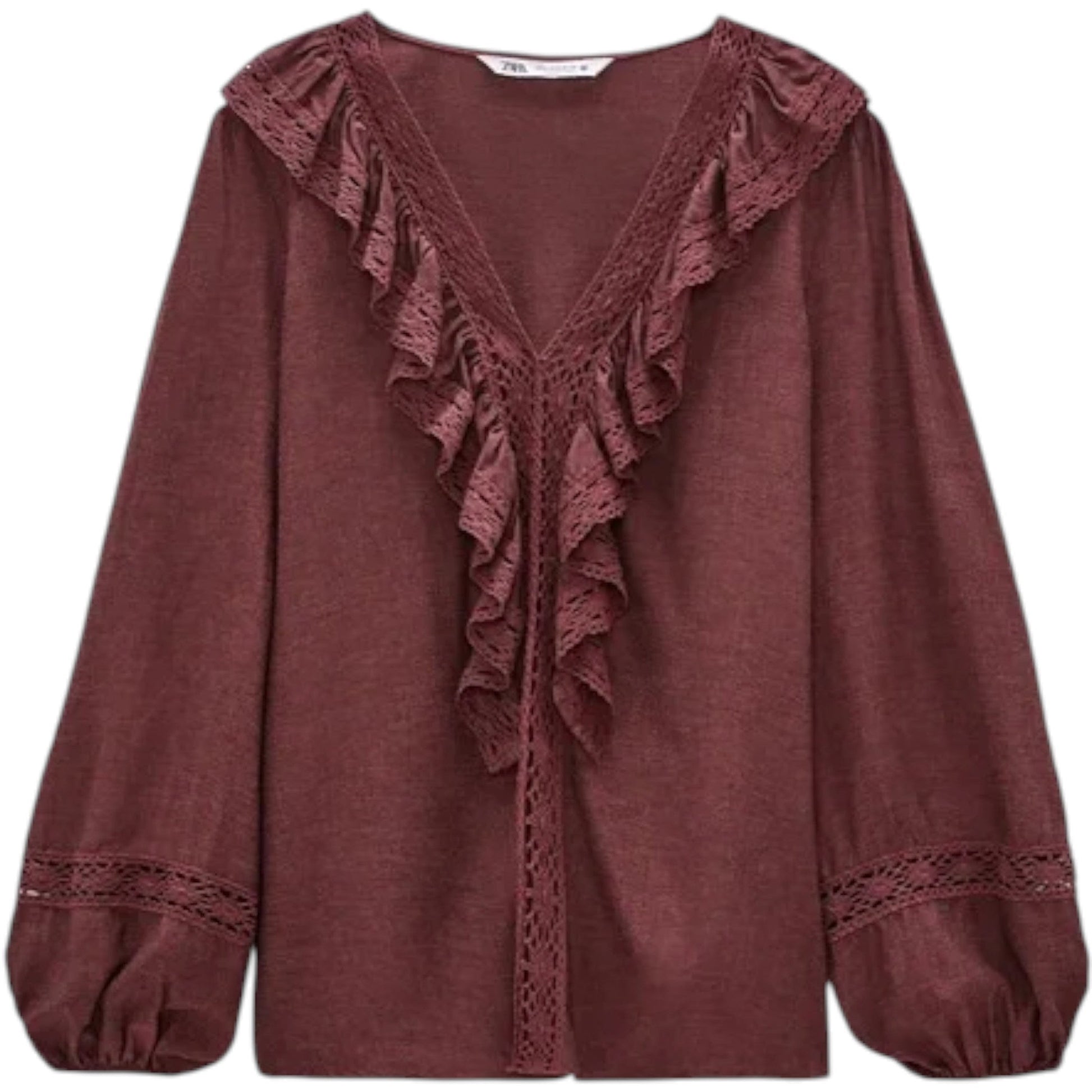 Címke nélküli, bordó (rózsaszínes) színű, hosszú ujjú blúz. V-nyakú, a dekoltázs körül fodros és csipke díszítésű. Az ujjvégek gumírozottak, az alkar részen csipkebetét van.