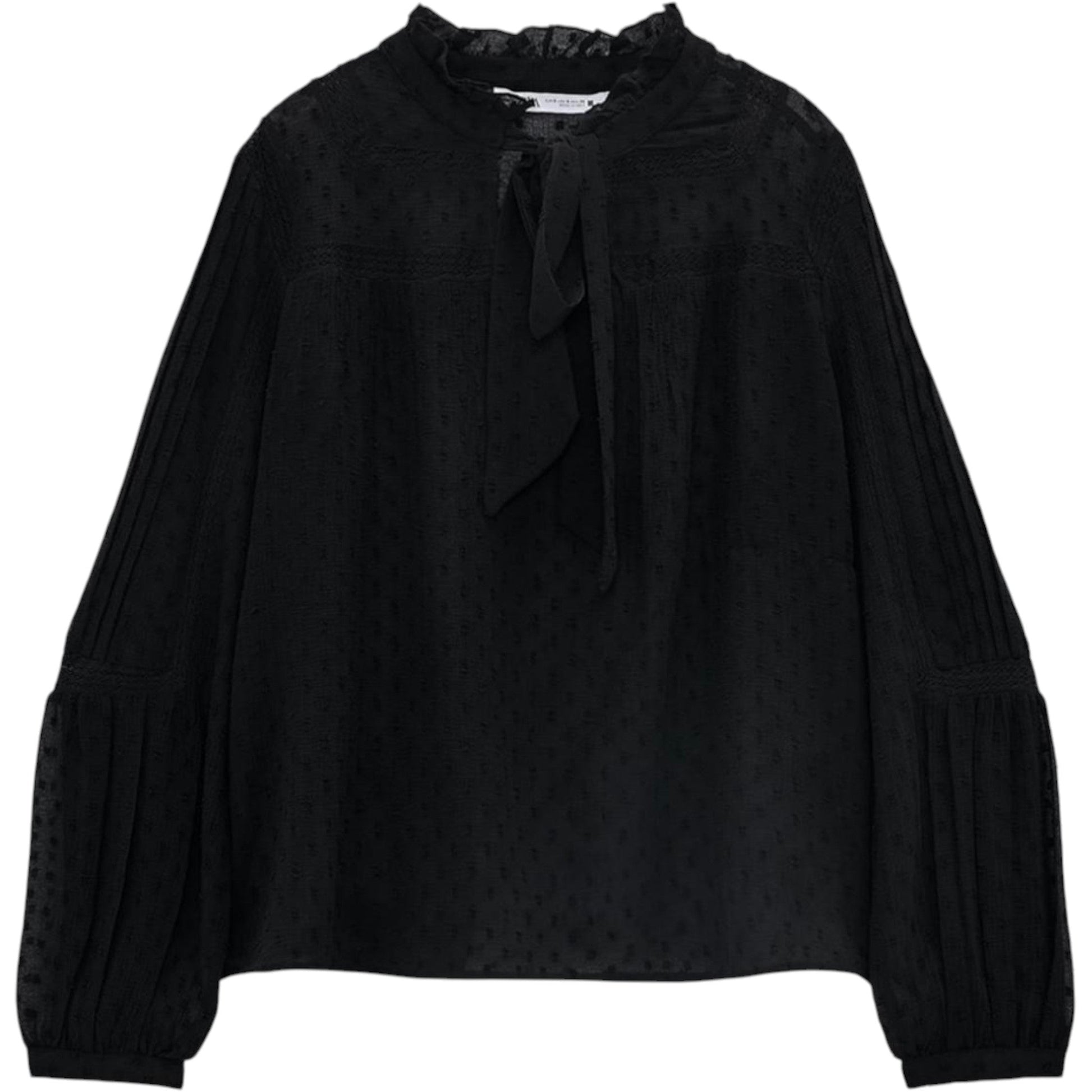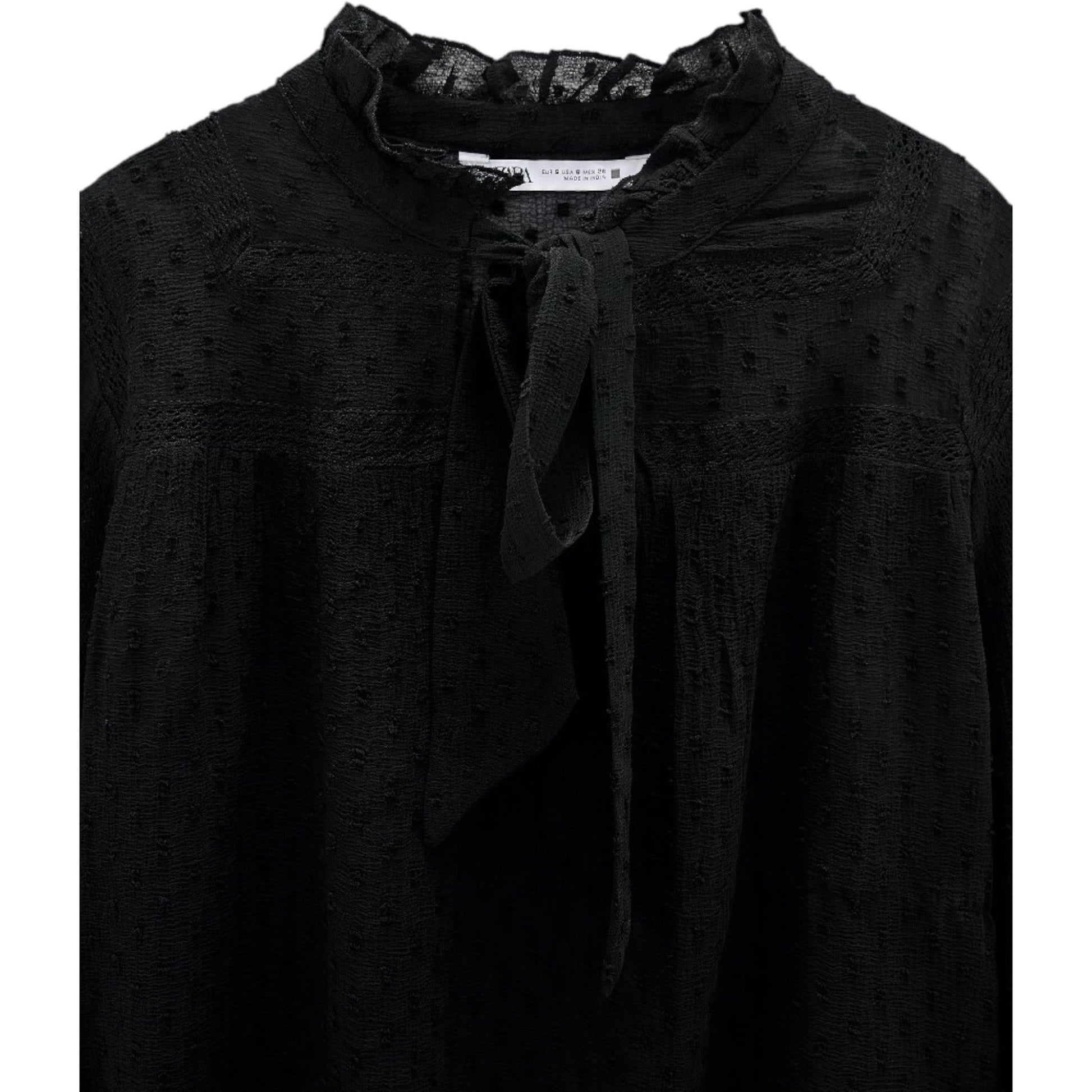 Címke nélküli, fekete, áttetsző anyagú blúz. Apró pontmintás, magas, fodros nyakú, masnira köthető szalaggal.