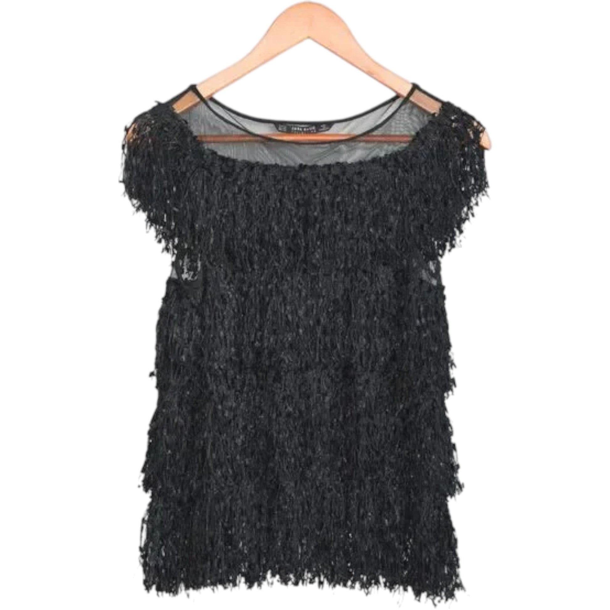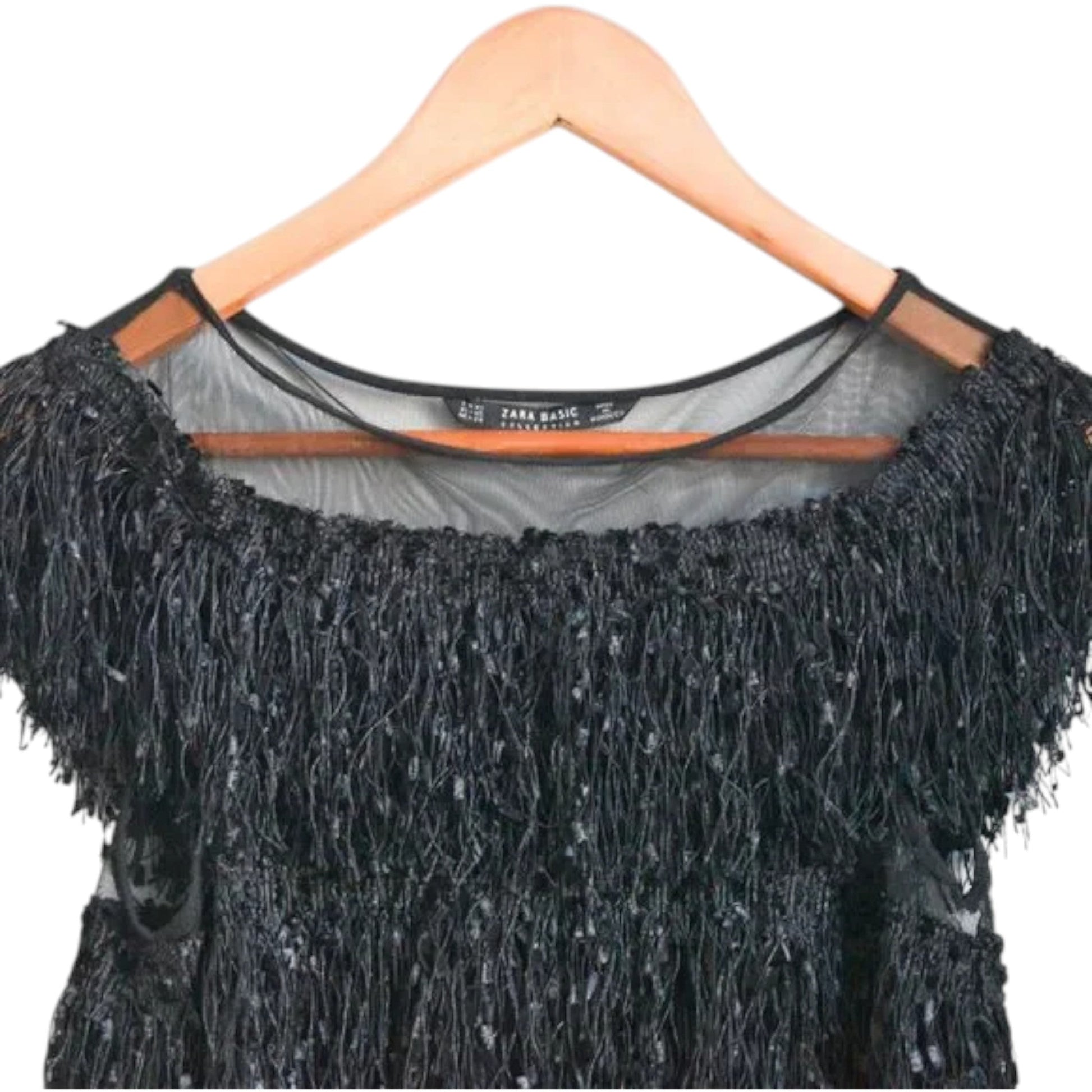 Címke nélküli, fekete színű, rövid ujjú felső. Áttetsző tüll alapra rojtok vannak varrva, rétegesen. Kerek nyakú.