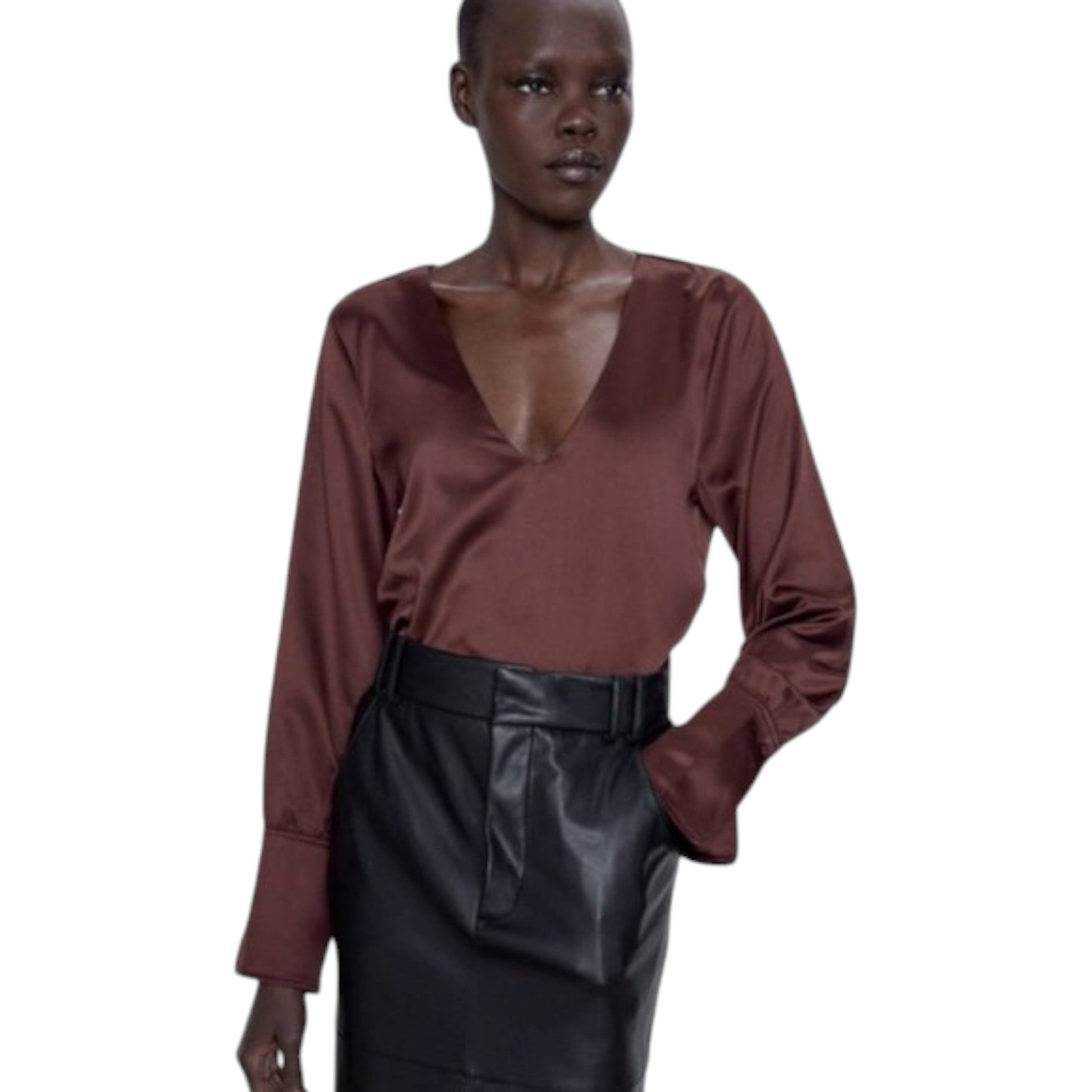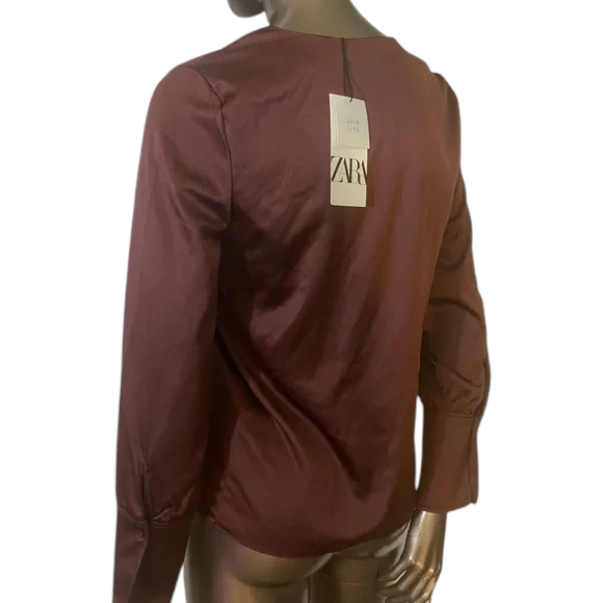 ZARA bordó szatén V-nyakú hosszú ujjú blúz