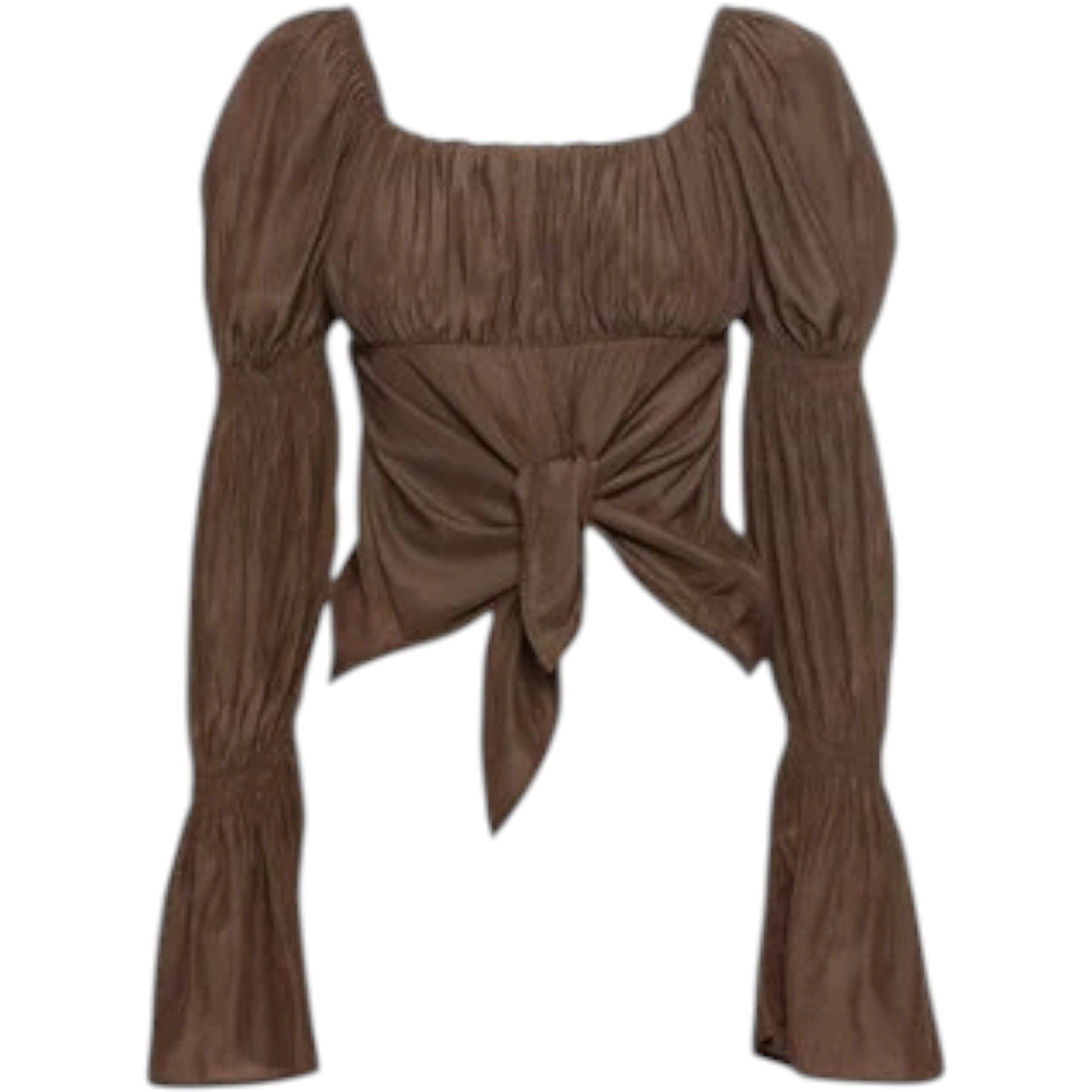 Címke nélküli, barna, hasított bőr hatású, négyzet alakú nyakkivágással, hosszú, harang alakú ujjakkal, mellrészen ráncolt, alul középen megköthető, crop fazonú (rövid).