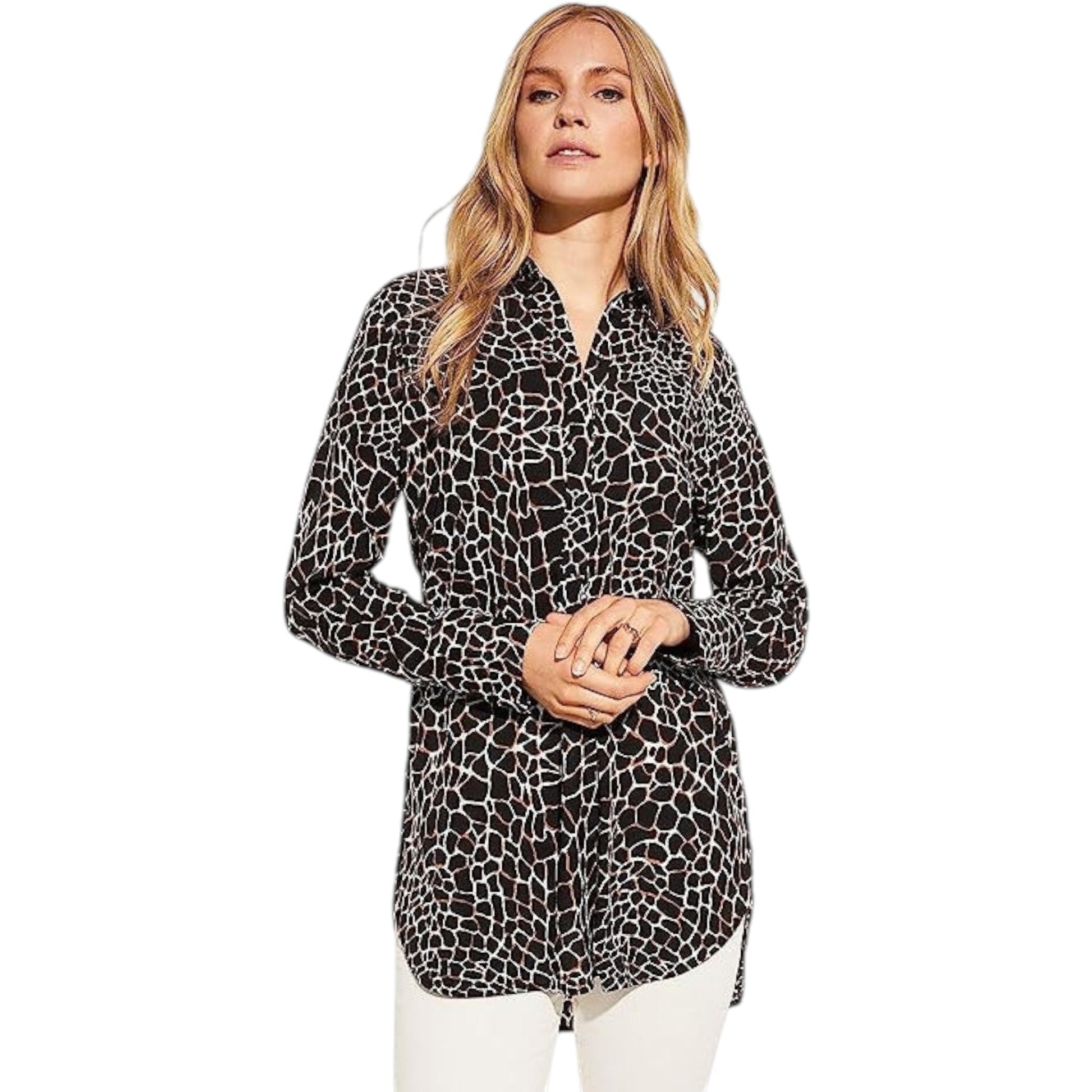 Címke nélküli, fekete és fehér színű, állatmintás (zsiráf/foltos) mintájú blúz, inggallérral, hosszú ujjú, hosszú tunika fazonú, lekerekített alsó szegéllyel, hátul hosszabb.