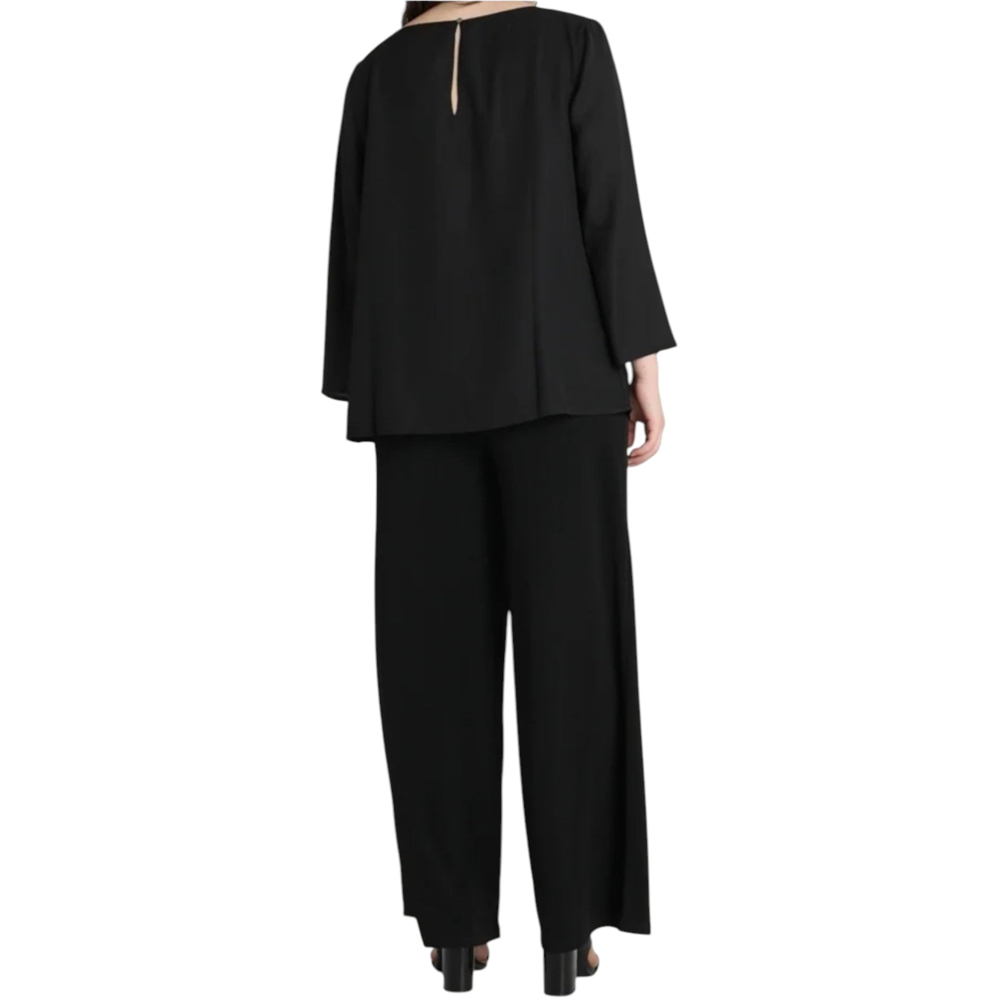 Címke nélküli, fekete, kerek nyakú, háromnegyedes trapéz ujjú blúz, nyakkivágásán gyöngyös/strasszos díszítéssel, hátul hasítékkal és gombolással.
