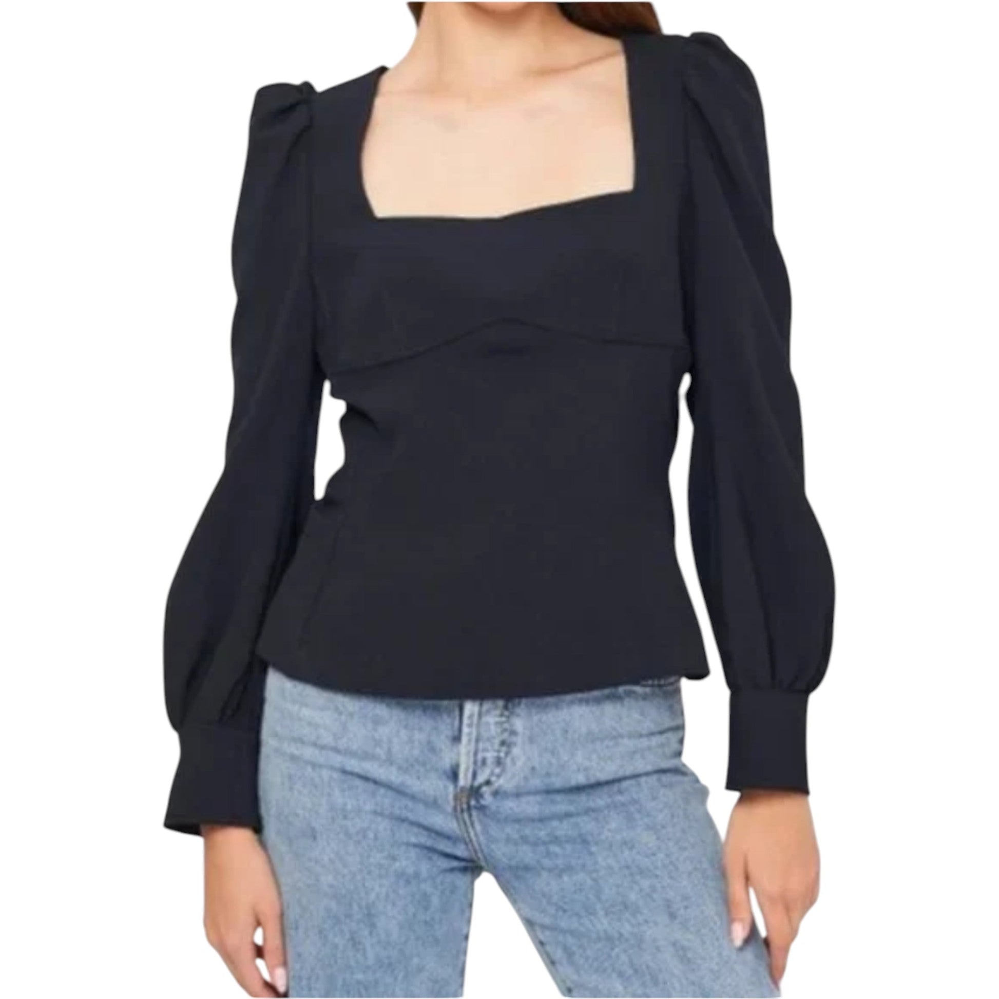 Címke nélküli, fekete, négyzet alakú dekoltázsú, hosszú puffos ujjú blúz, karcsúsított fazonú, szűkített mandzsettával.