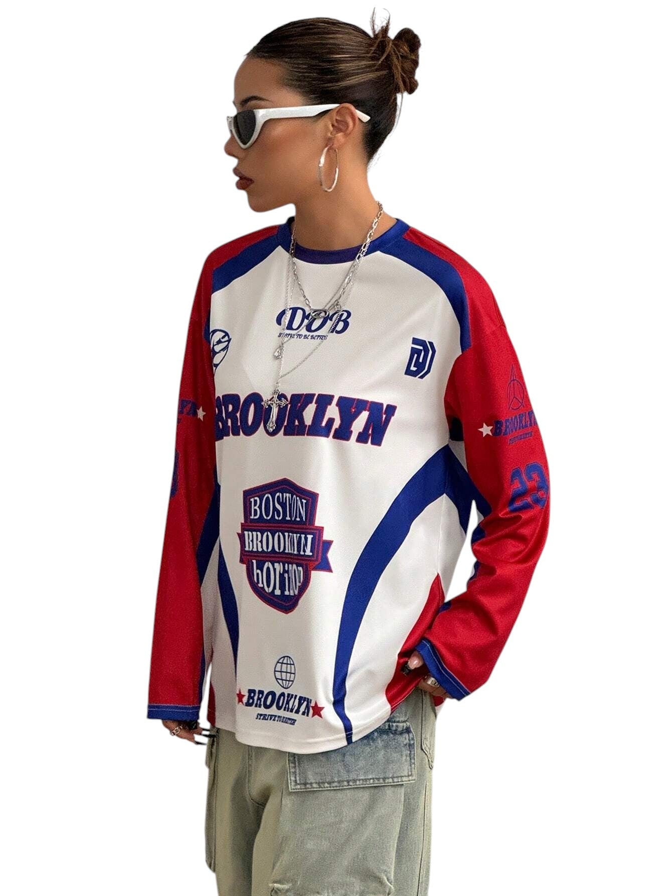 Címke nélküli, fehér, piros és kék színblokkos, hosszú ujjú sport felső logókkal és grafikával.