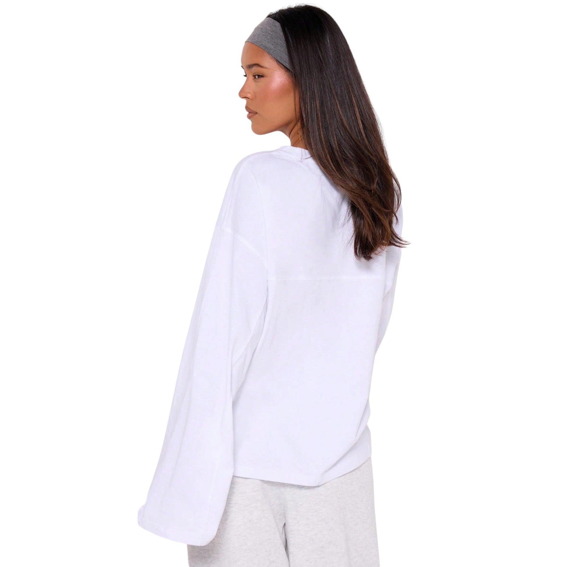 Címke nélküli, fehér, hosszú ujjú, kerek nyakú, crop top.