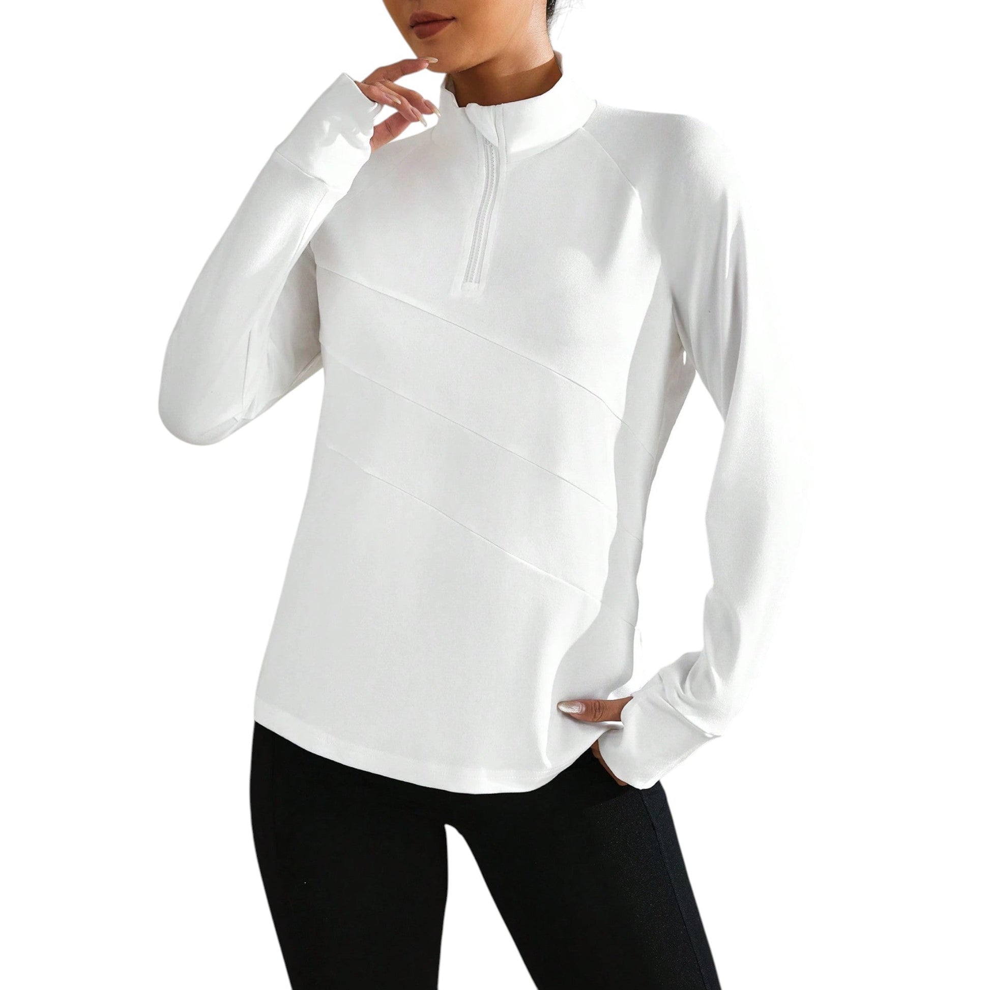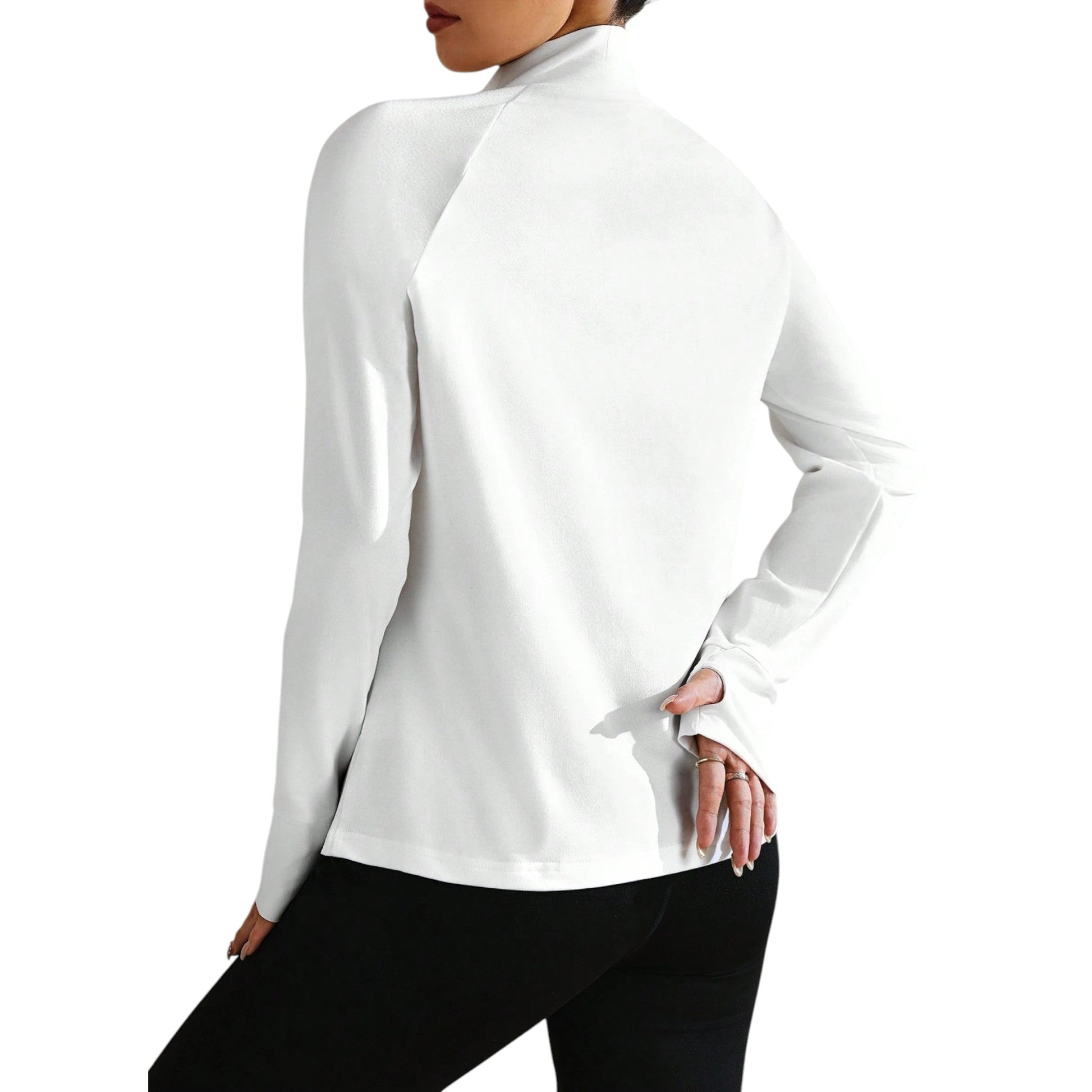 Címke nélküli, fehér, hosszú ujjú sportpulóver állógallérral, rövid cipzárral elöl, és ujjhüvelykkel ellátott mandzsettával. Mellkasán V-alakú varrások díszítik.