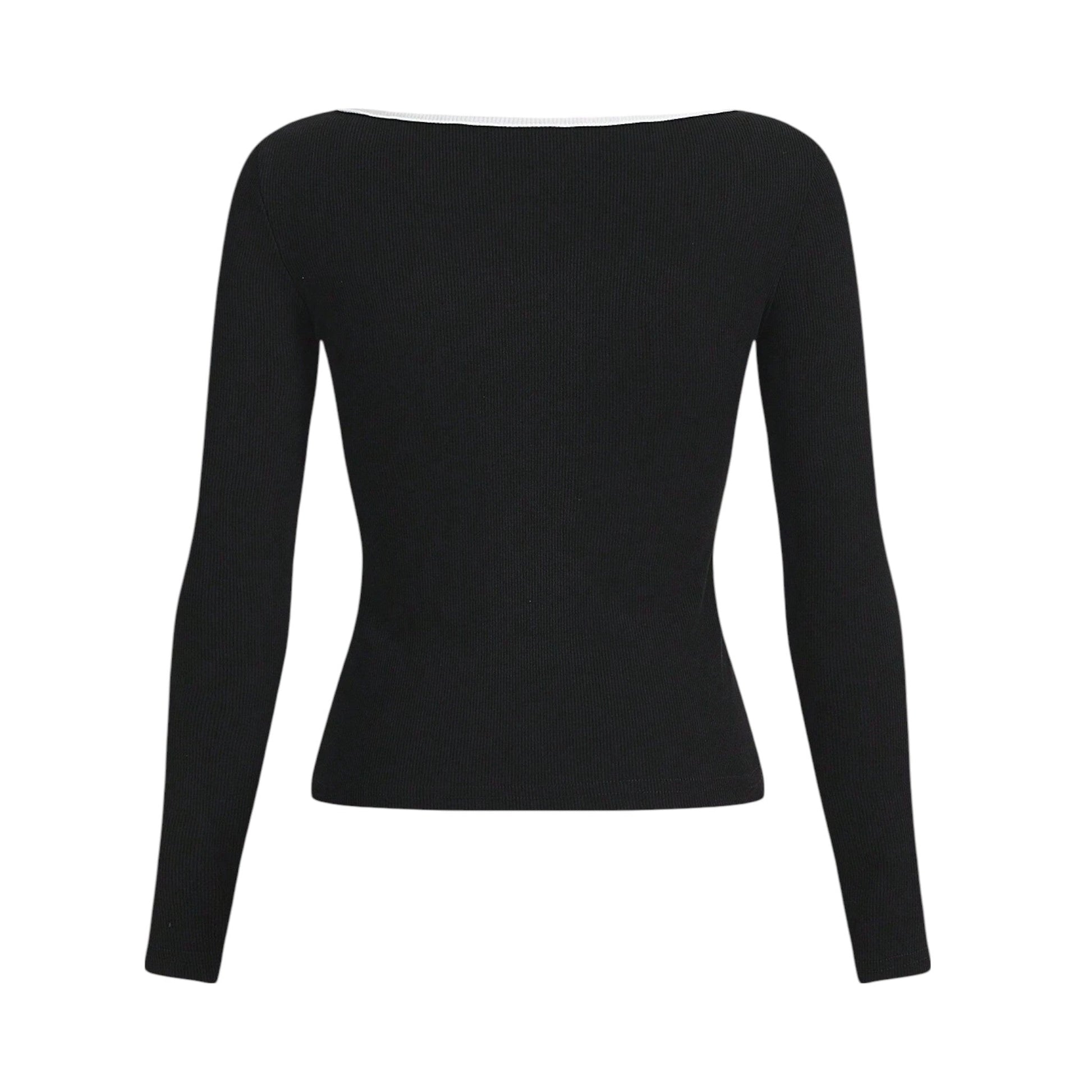 Címke nélküli, fekete, kötött anyag, testhezálló fazon, hosszú ujjú, kontrasztos fehér szegéllyel a nyakkivágáson, V-alakú dekoltázzsal.