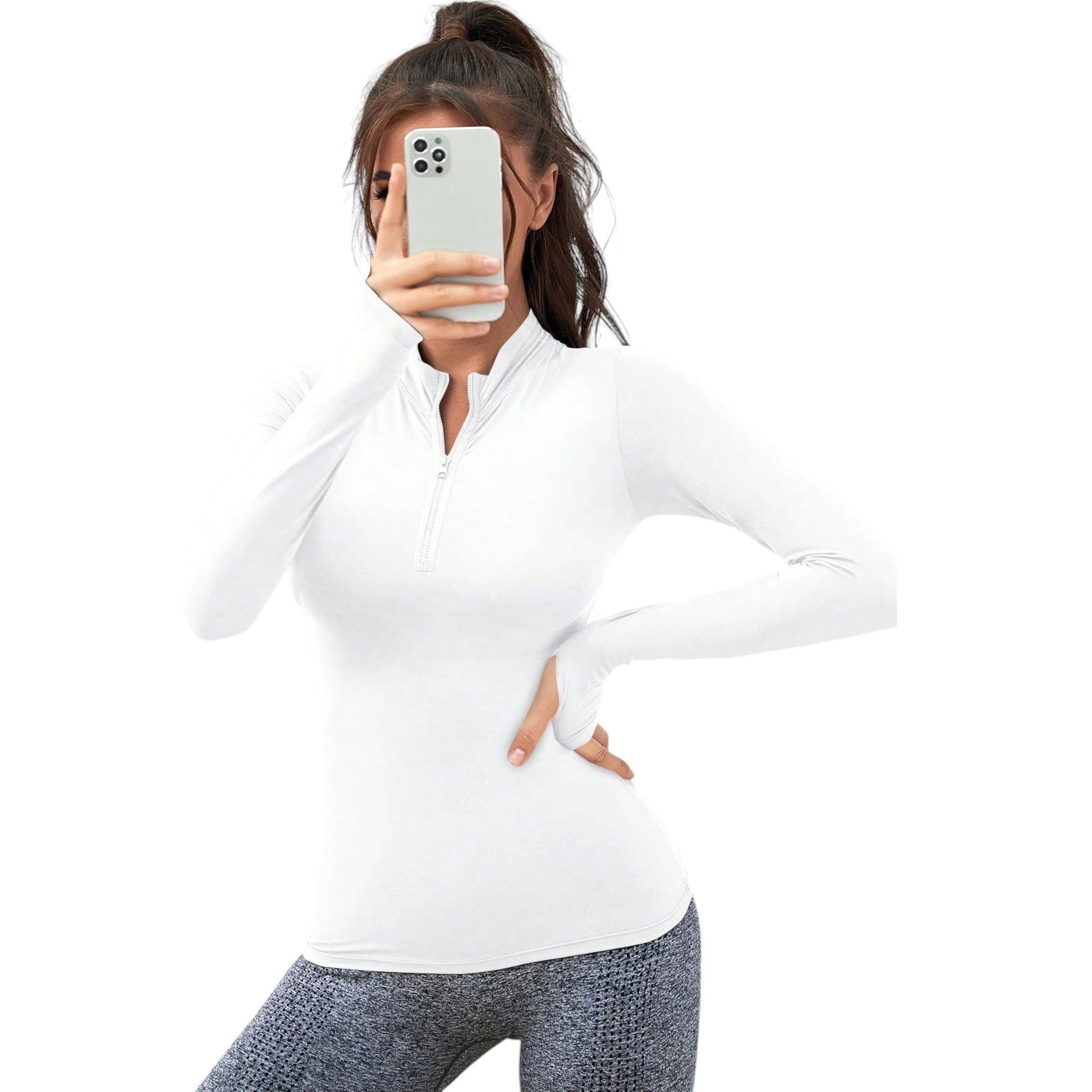 Címke nélküli, fehér színű, hosszú ujjú, cipzáras sport felső, hüvelykujj bújtatóval.