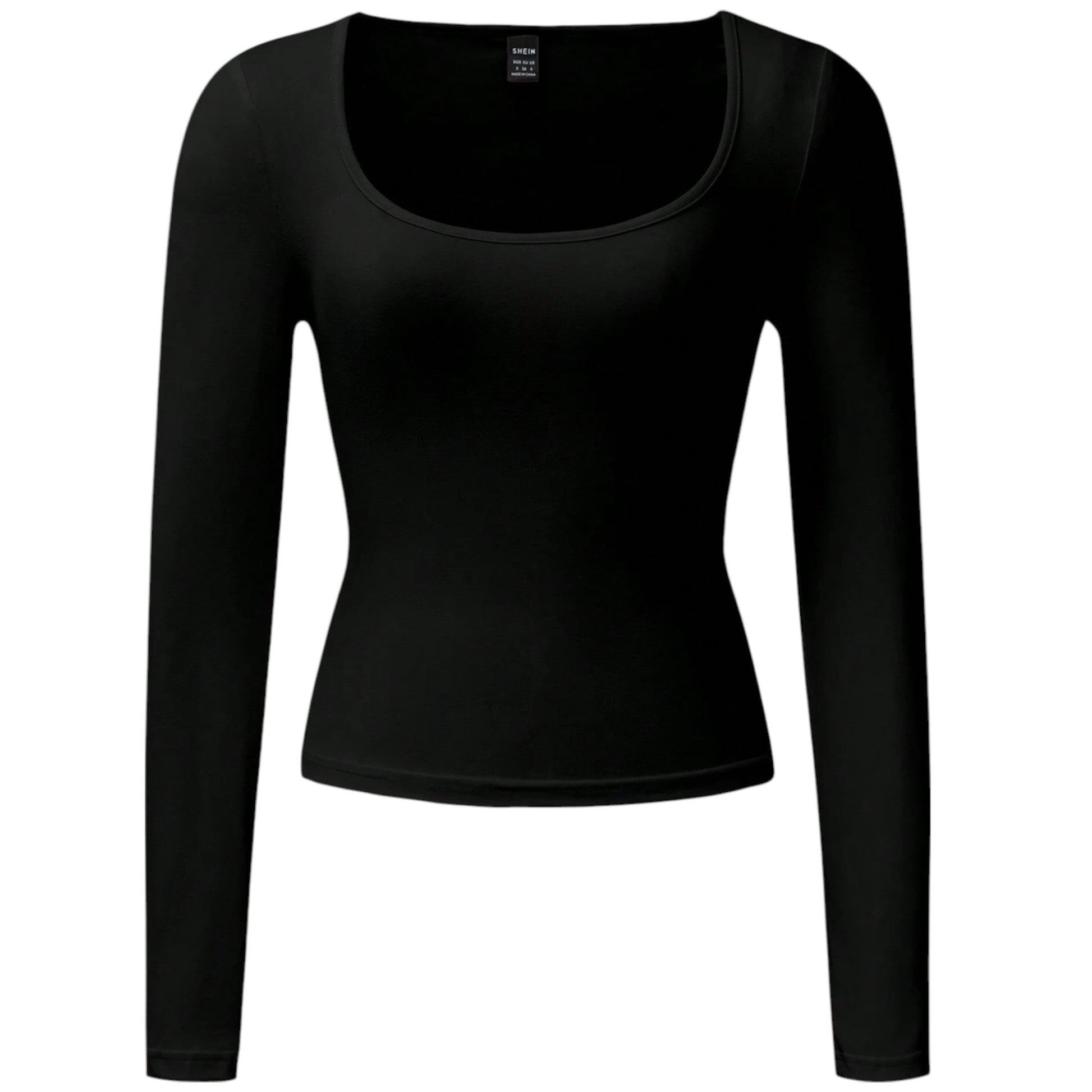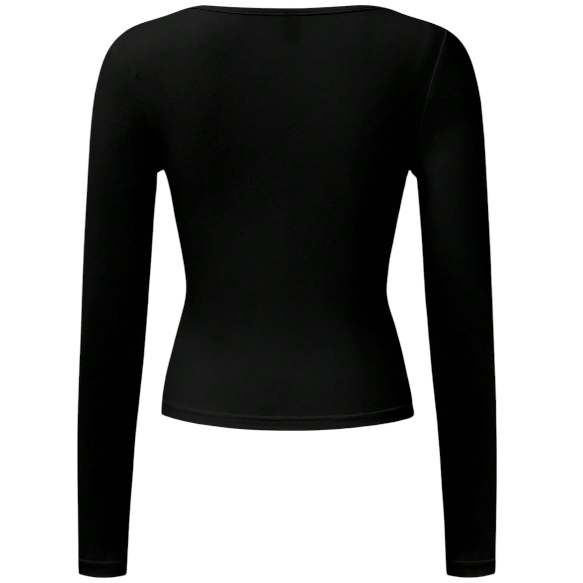 Címke nélküli, fekete, hosszú ujjú, négyzet alakú nyakkivágású felső, testhezálló szabással.
