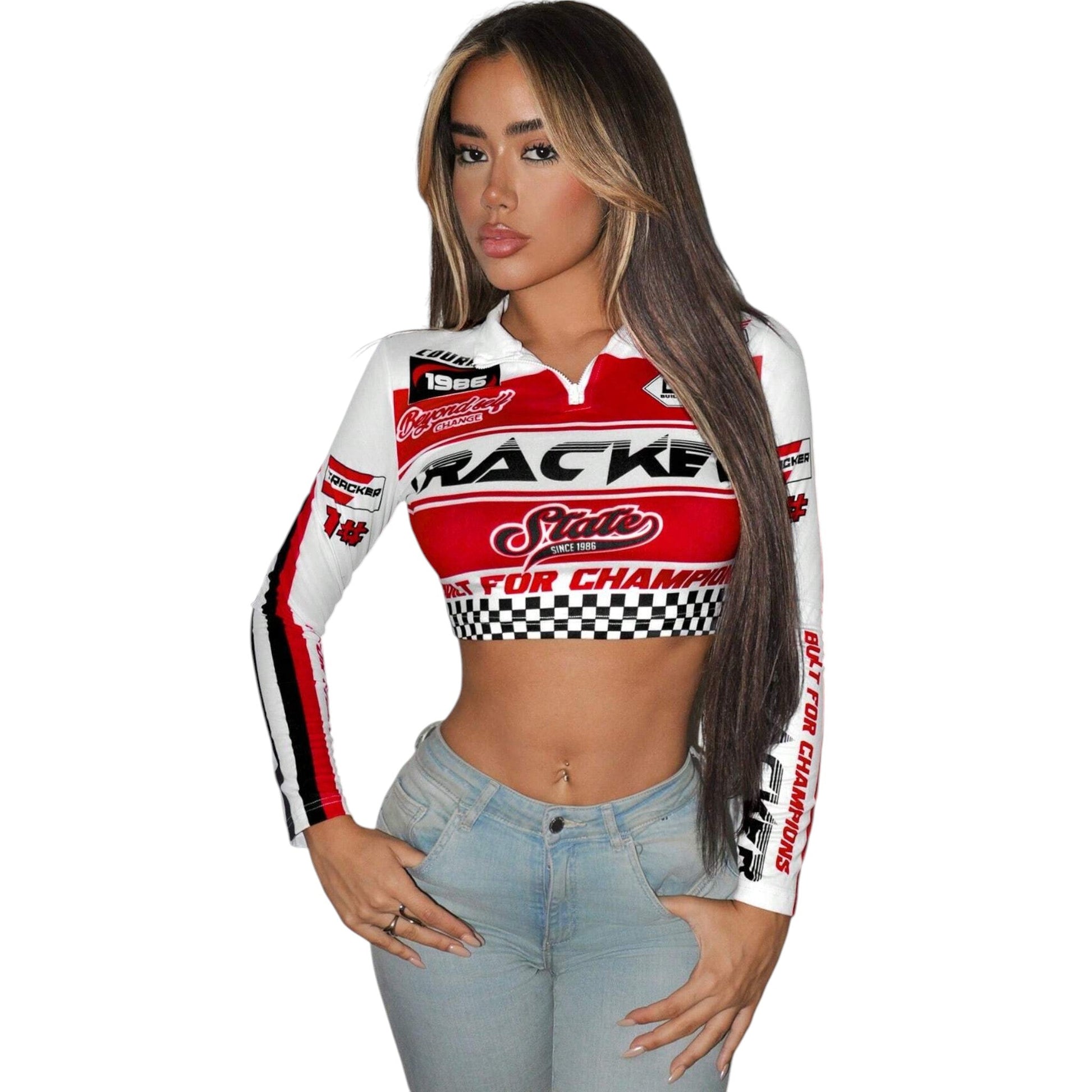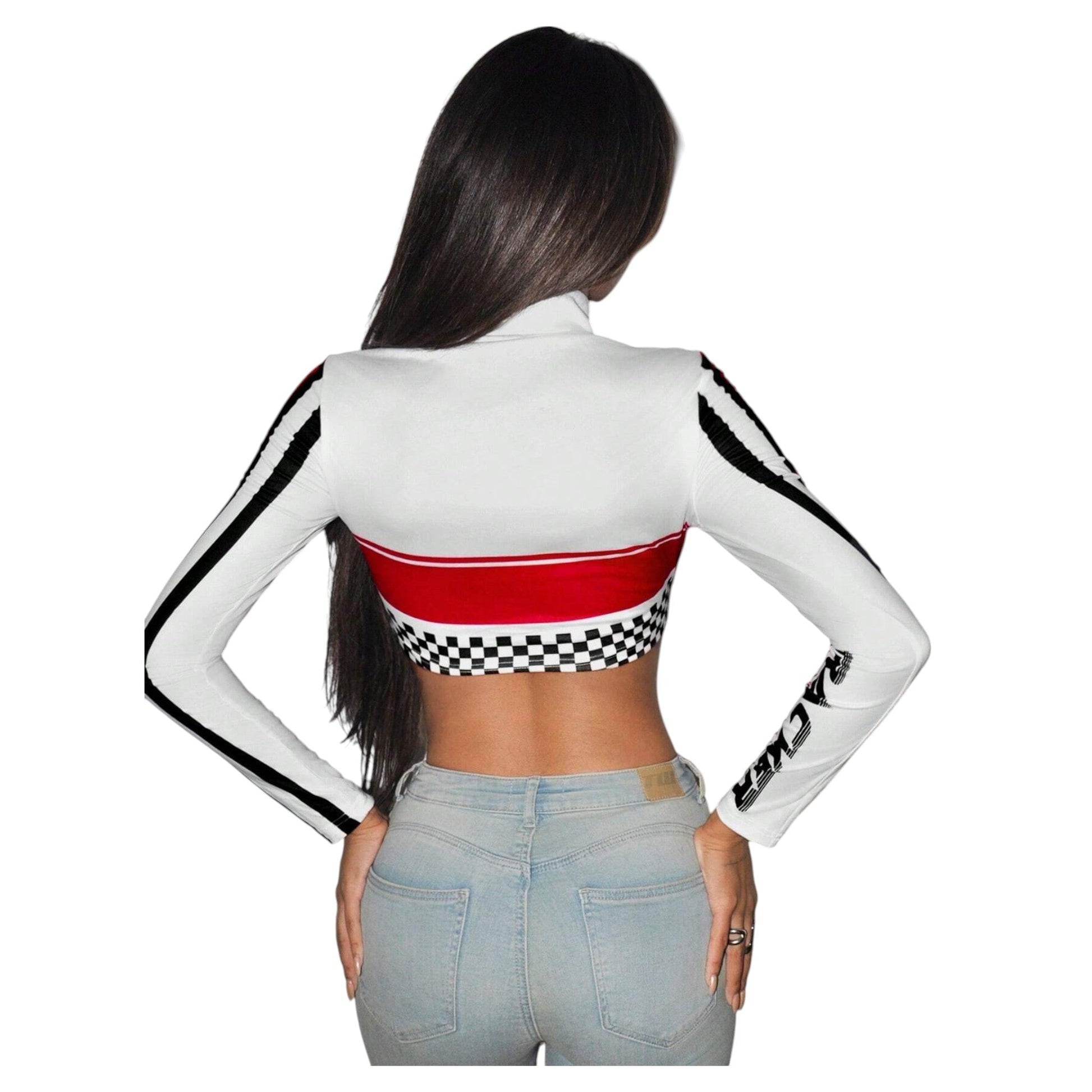 Címke nélküli, többszínű, hosszú ujjú, galléros, crop fazonú, racing mintás.