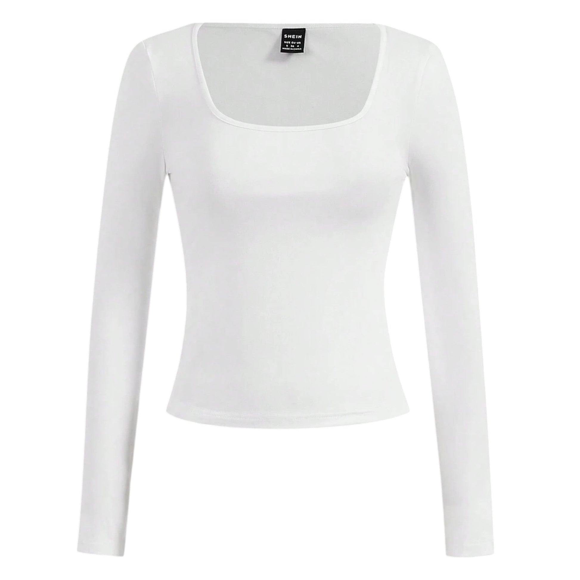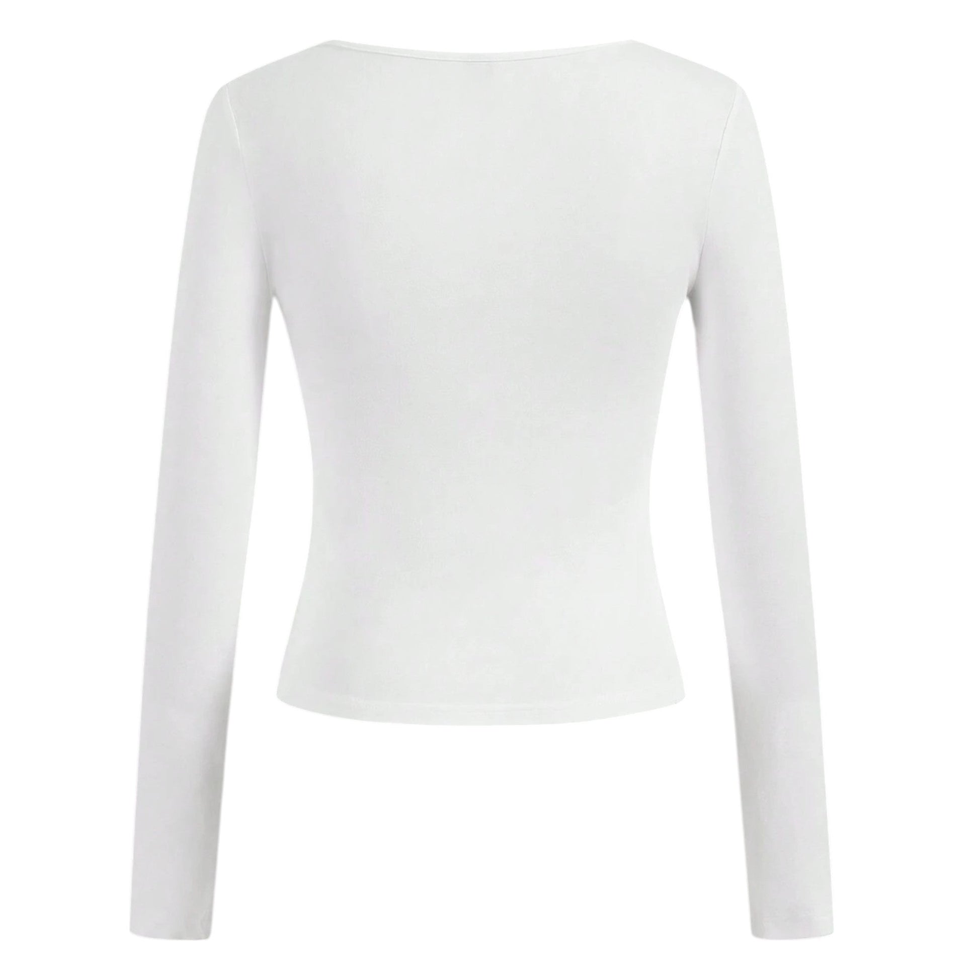 Címke nélküli, fehér, hosszú ujjú, négyzet alakú nyakkivágással, testhezálló fazon.