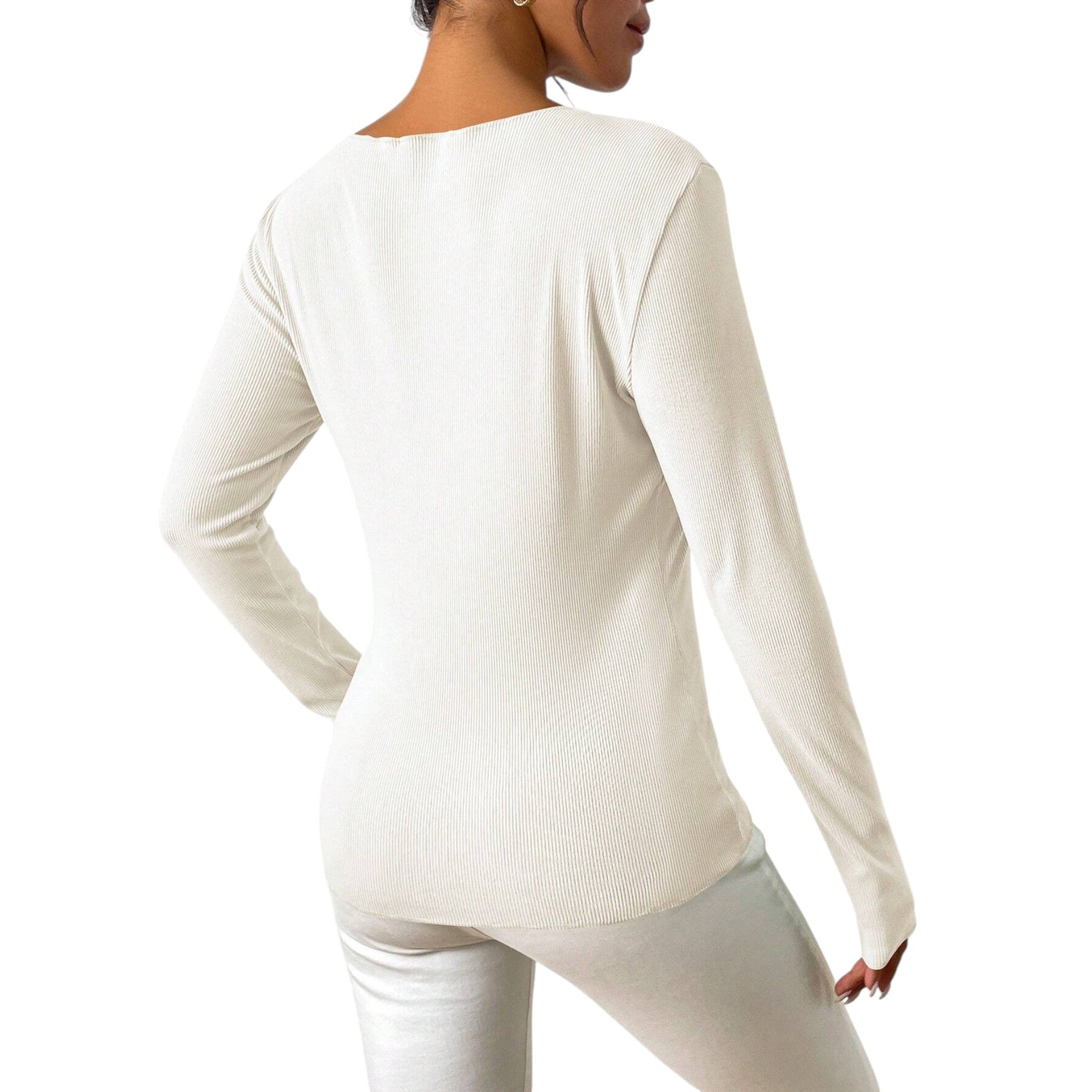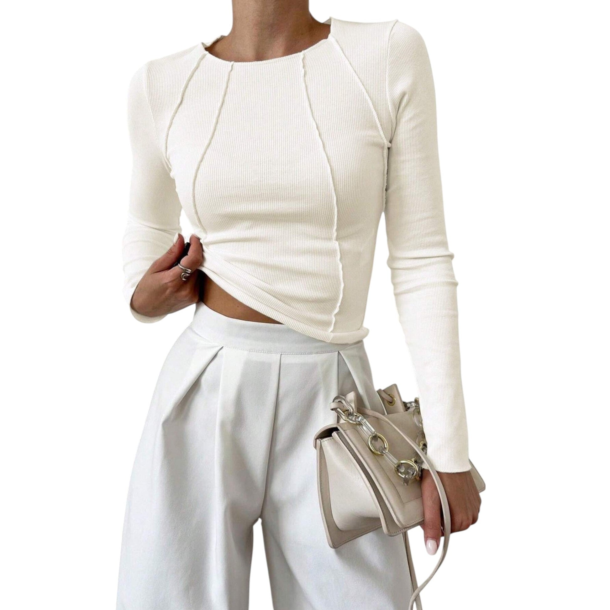 Címke nélküli, fehér, hosszú ujjú, kerek nyakú, bordázott anyagú felső, látható varrásokkal.