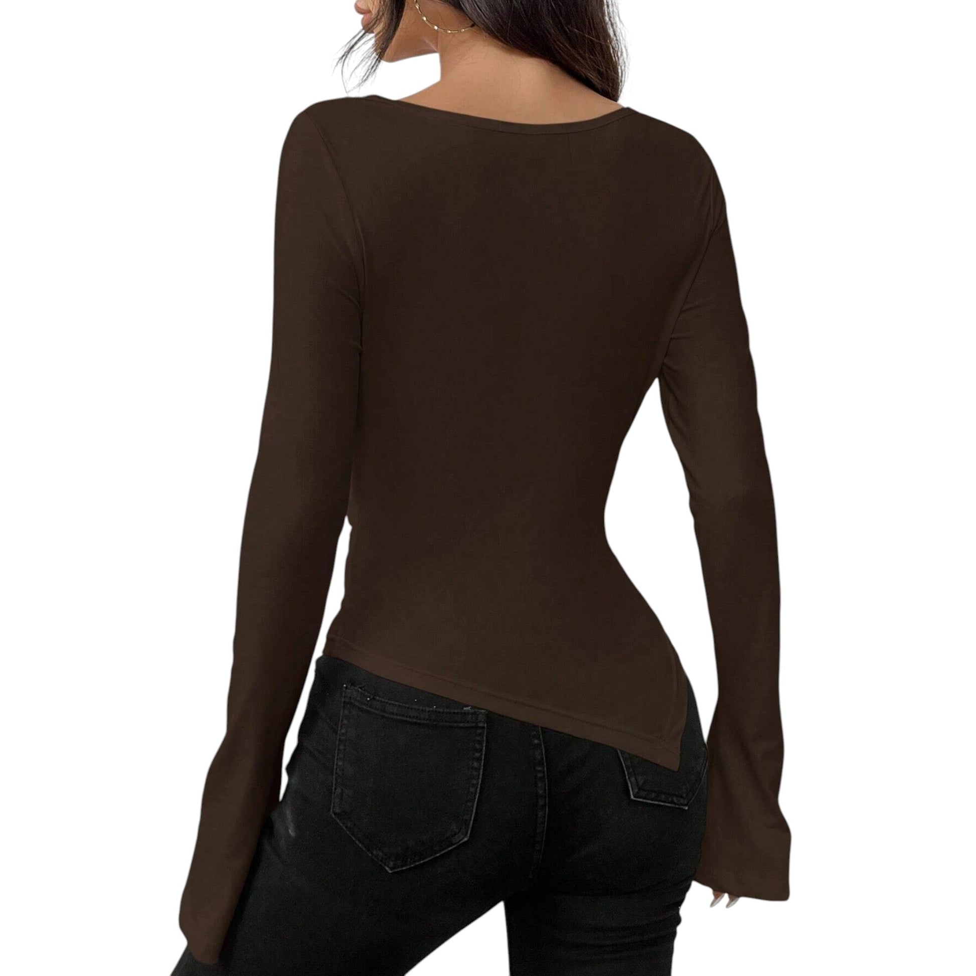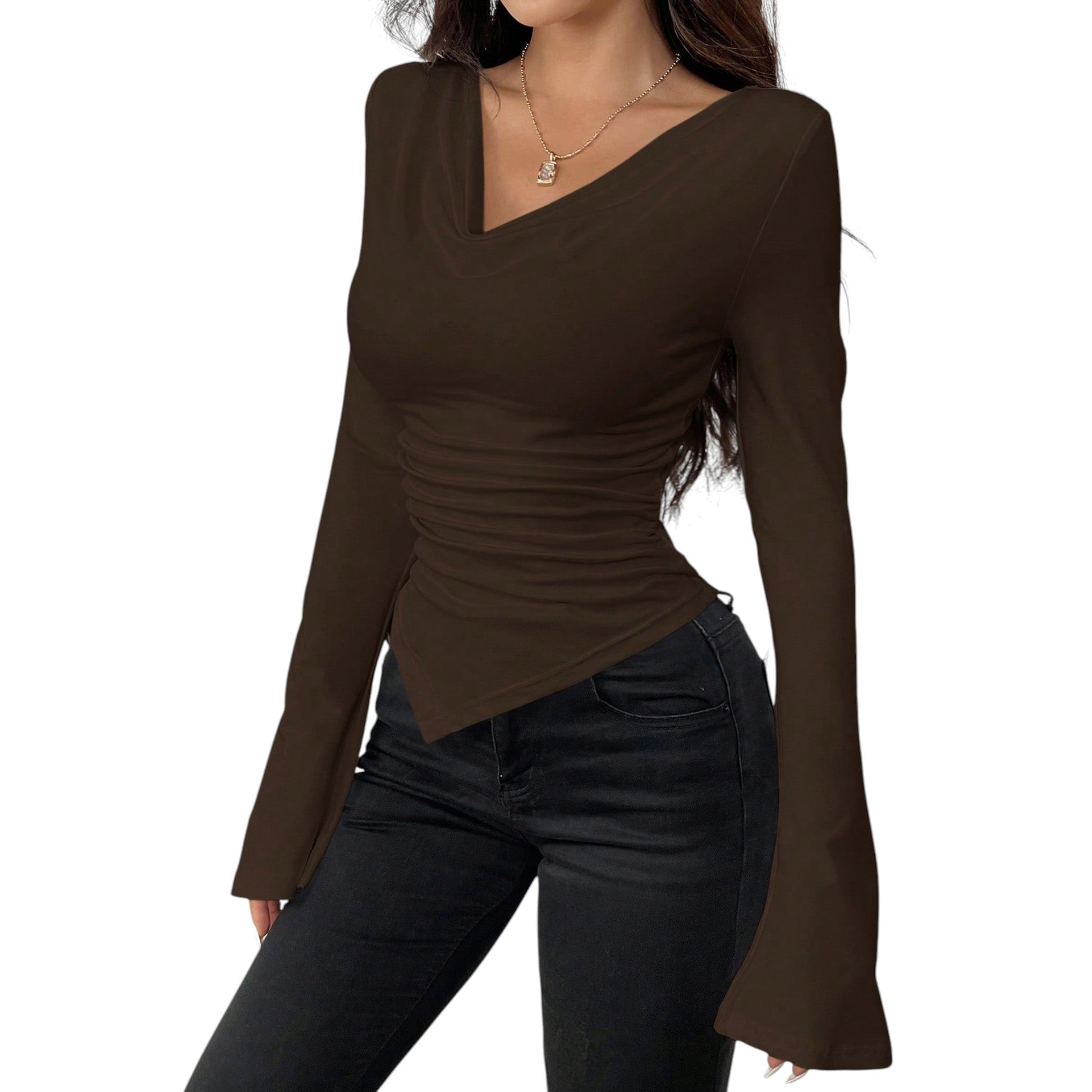 Címke nélküli, fekete, V-nyakú, hosszú harangujjú, aszimmetrikus aljú, ráncolt.