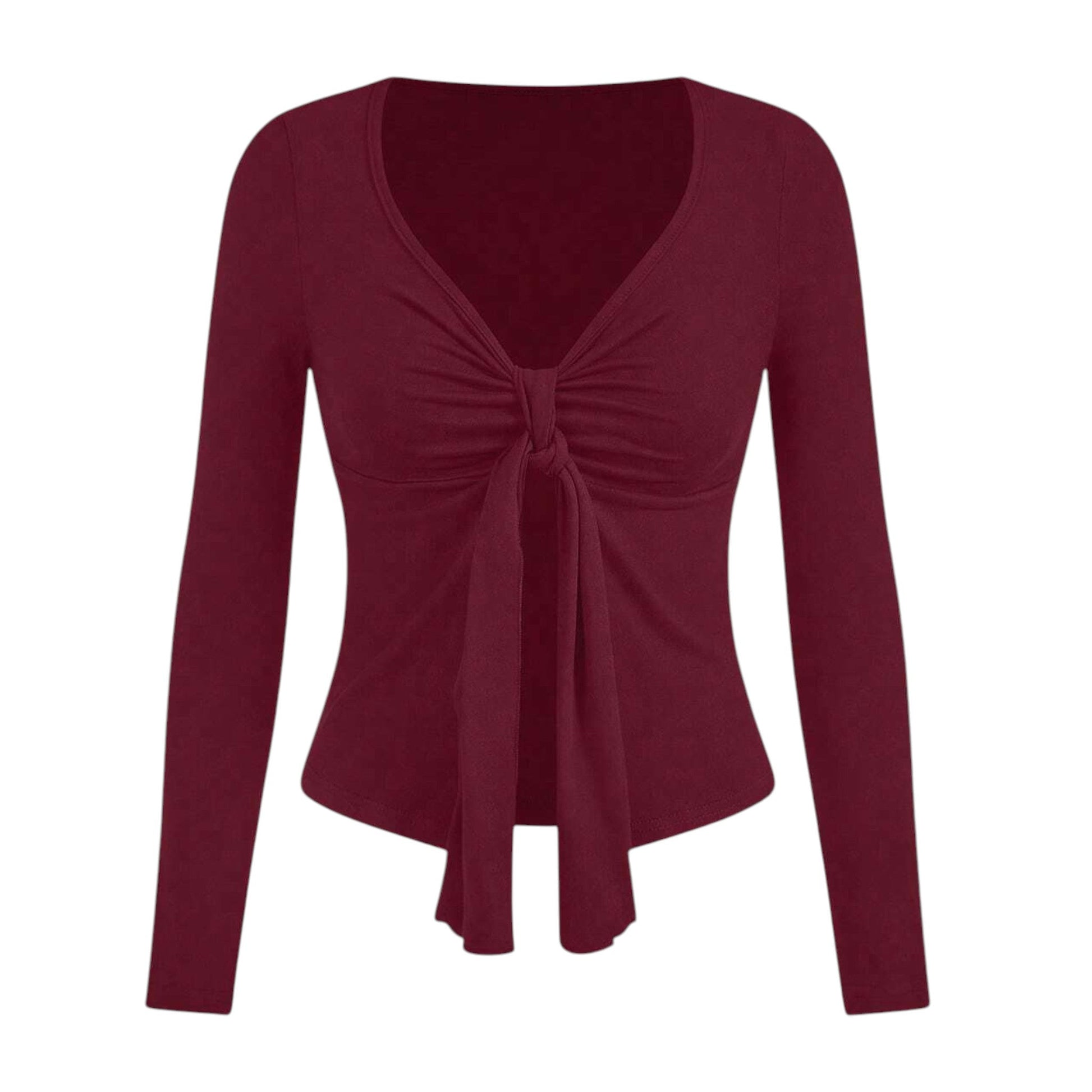 Címke nélküli, bordó, hosszú ujjú felső, V-nyakú, elől megkötős.