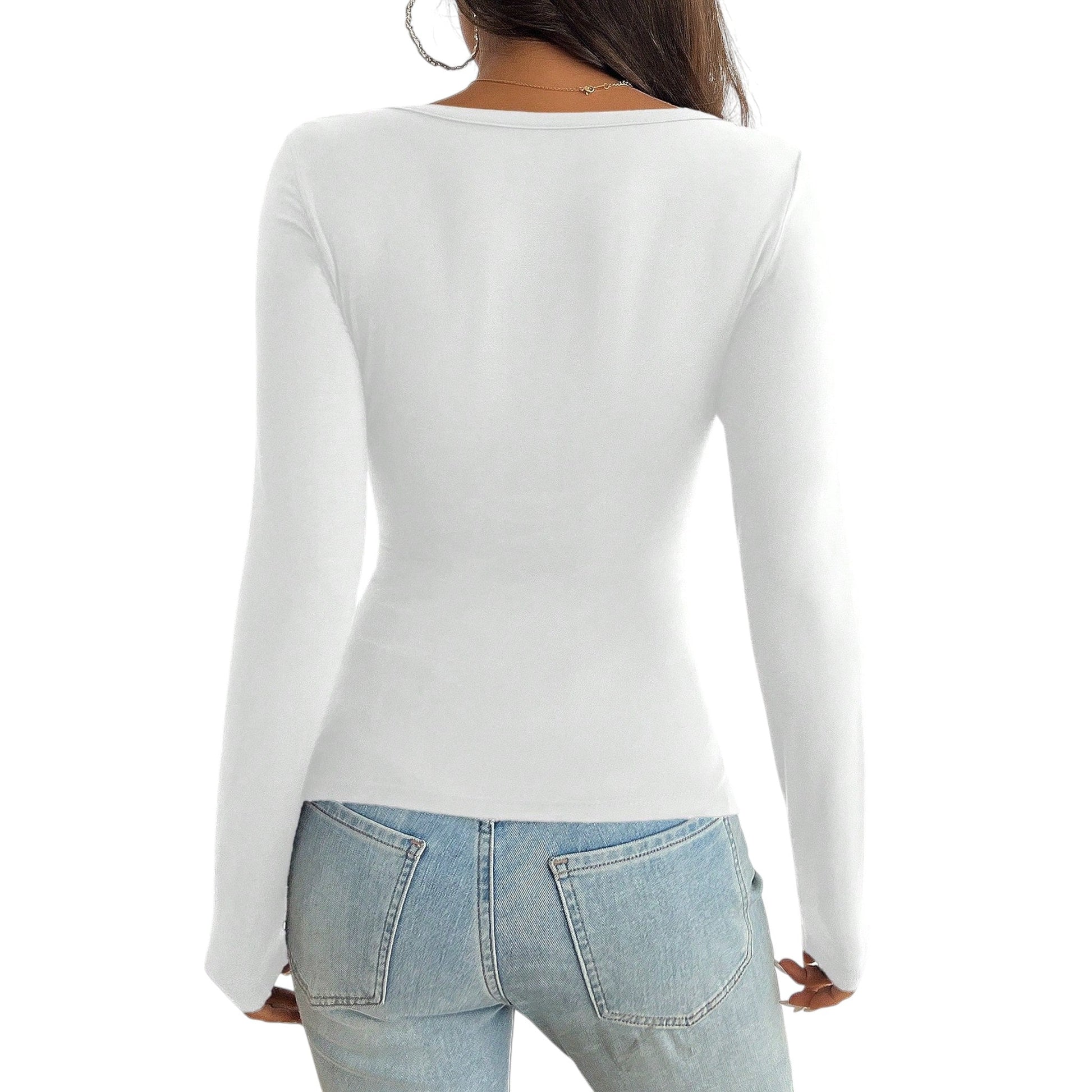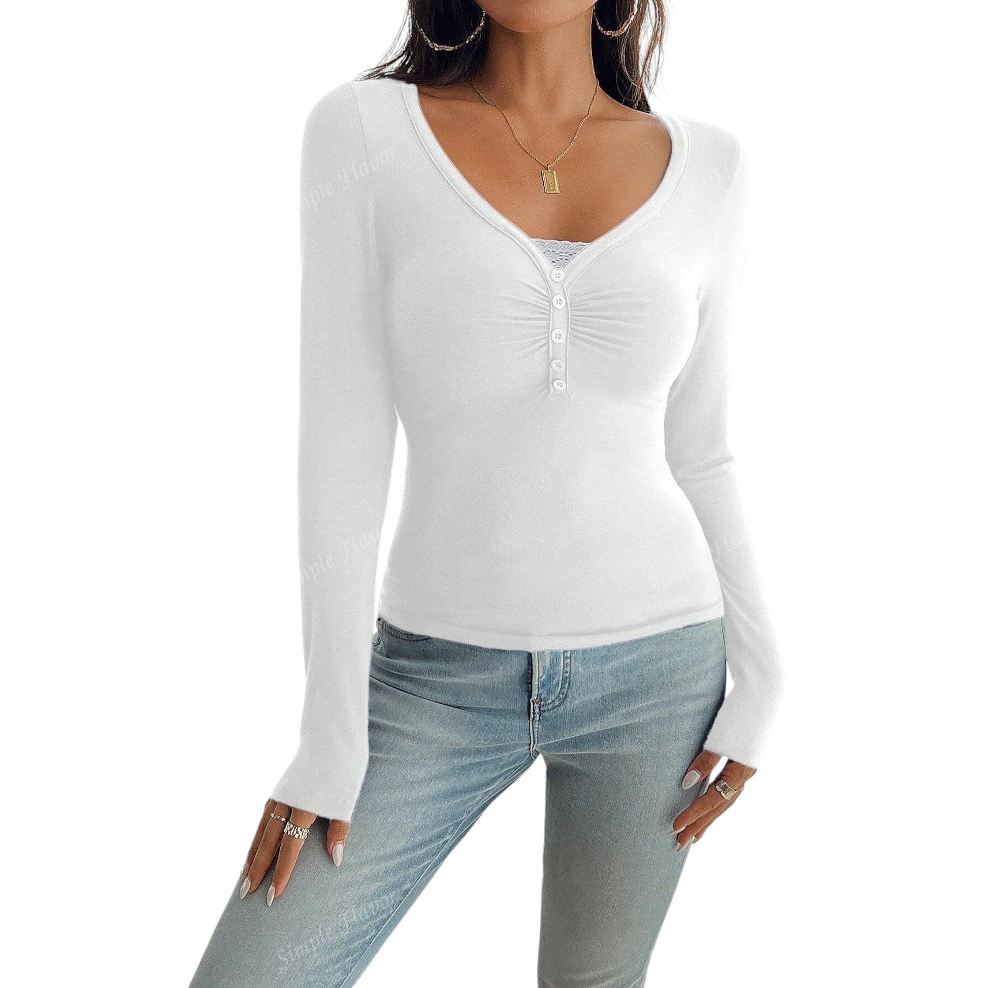 Címke nélküli, fehér, hosszú ujjú, V-nyakú felső, elöl gombokkal és csipke díszítéssel.