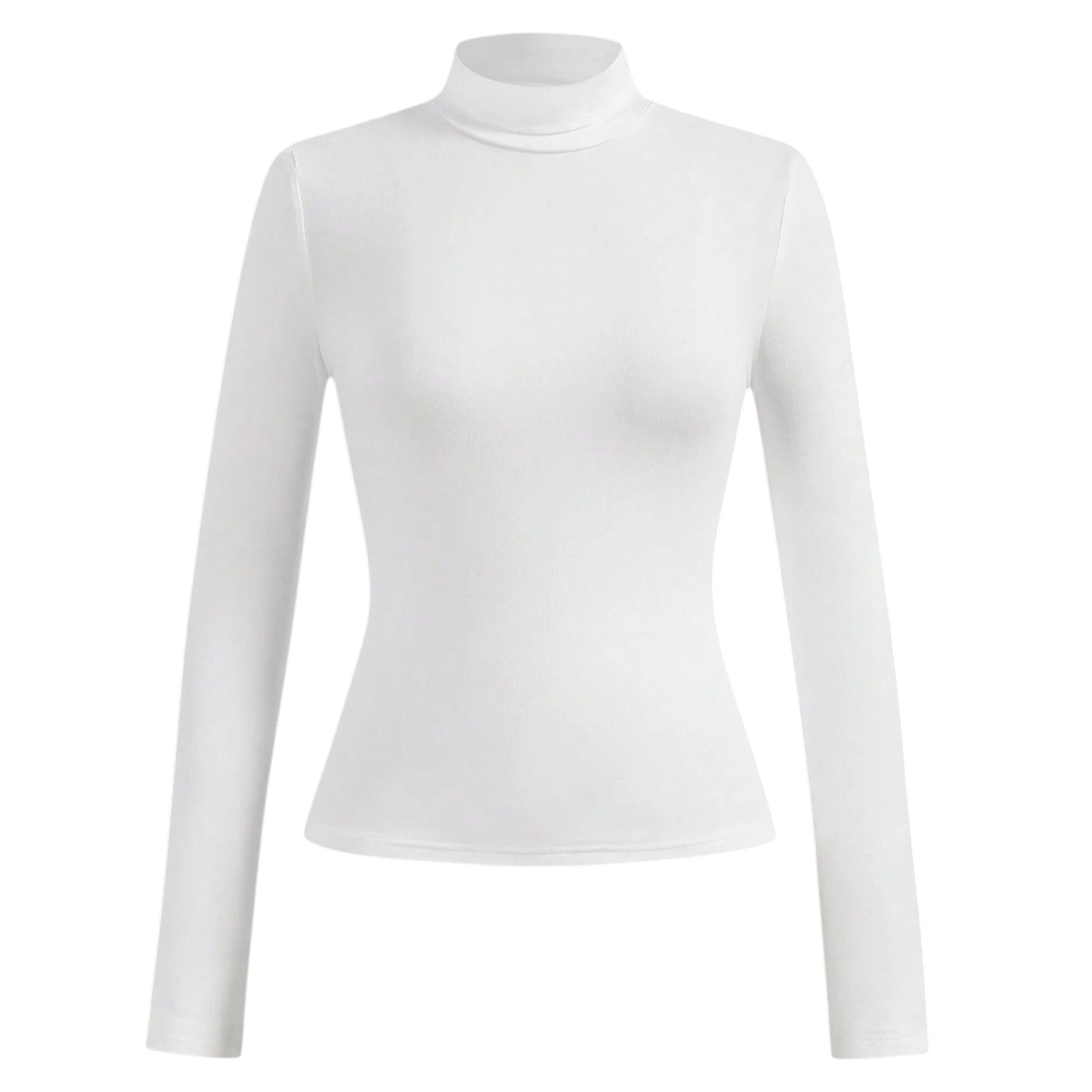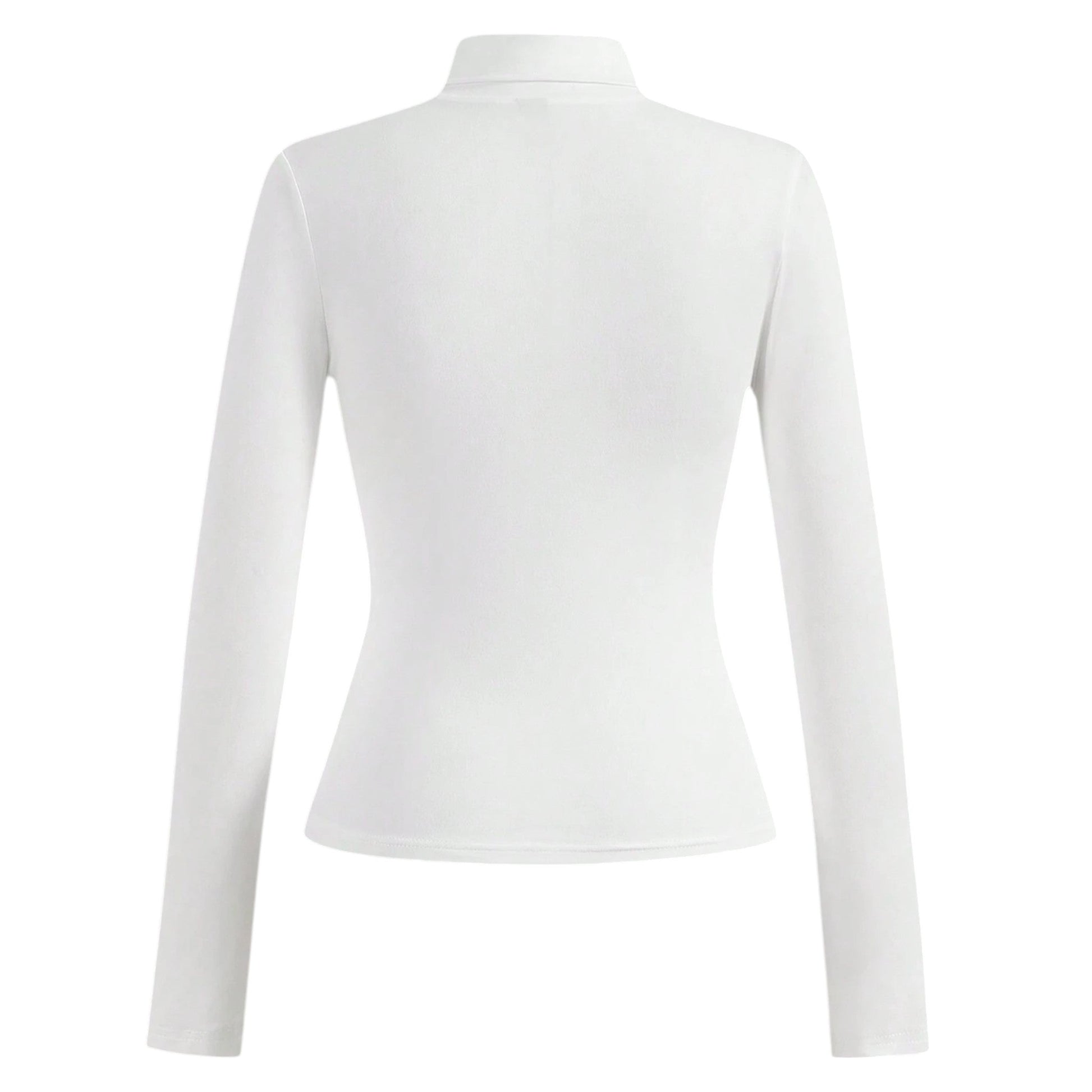 Címke nélküli, fehér, garbó nyakú, hosszú ujjú, testhezálló felső.