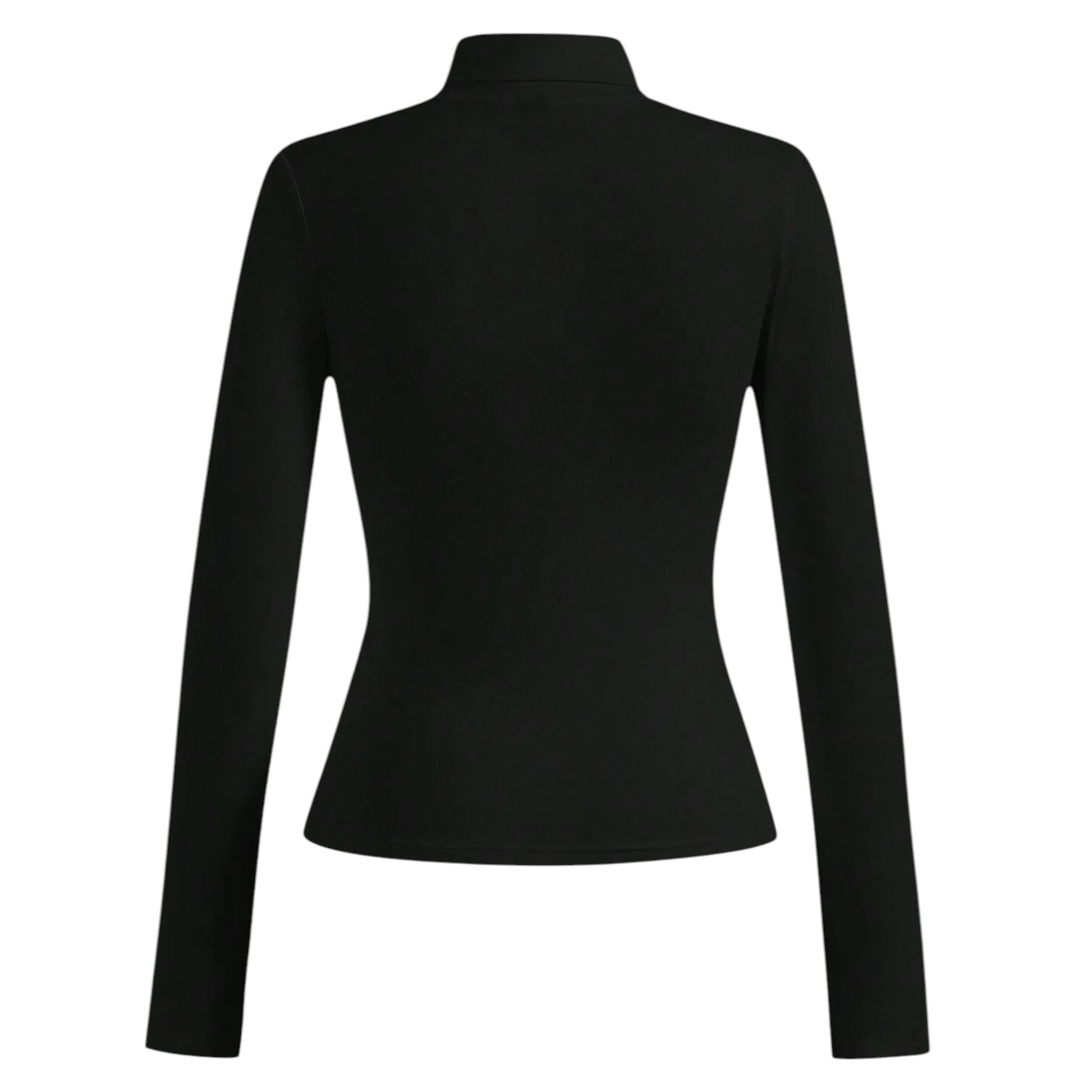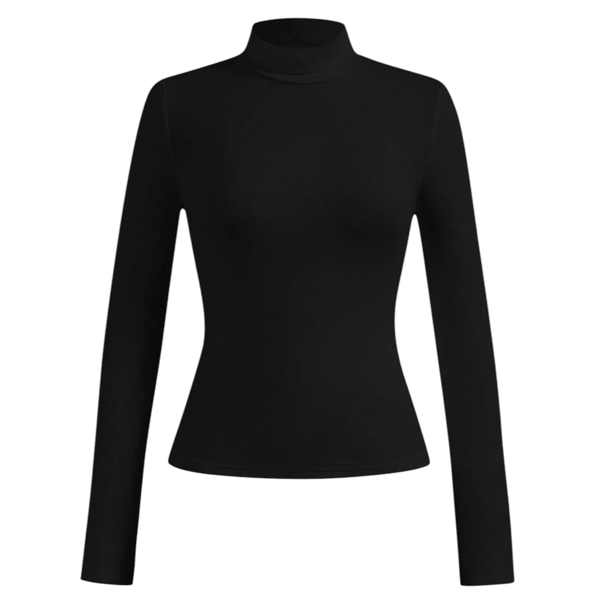 Címke nélküli, fekete, garbó nyakú, hosszú ujjú, testhezálló felső.