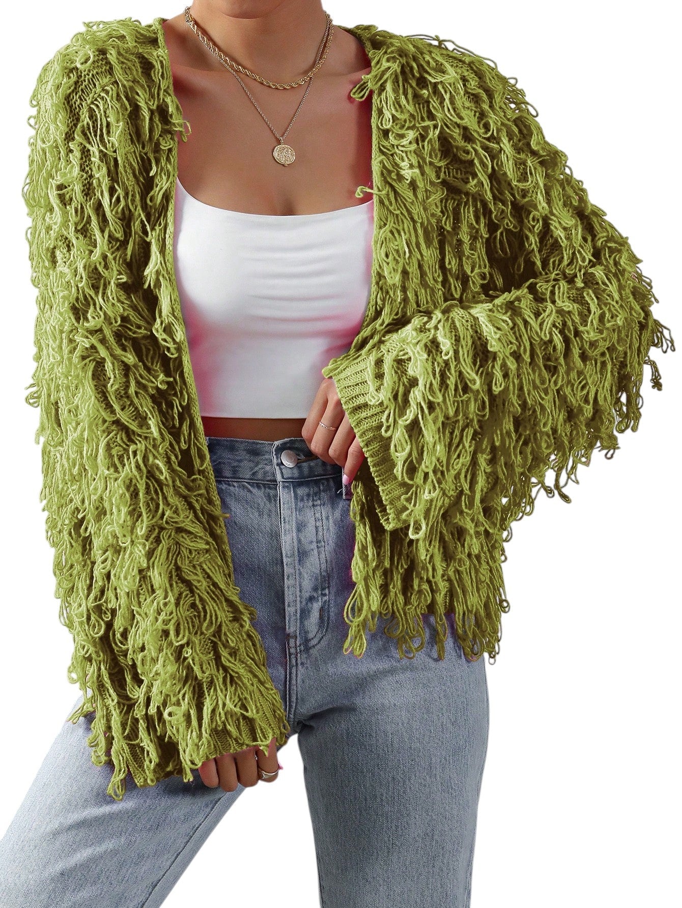 Címke nélküli, világoszöld, nyitott elejű, hosszú ujjú, bojtos kötött kardigán