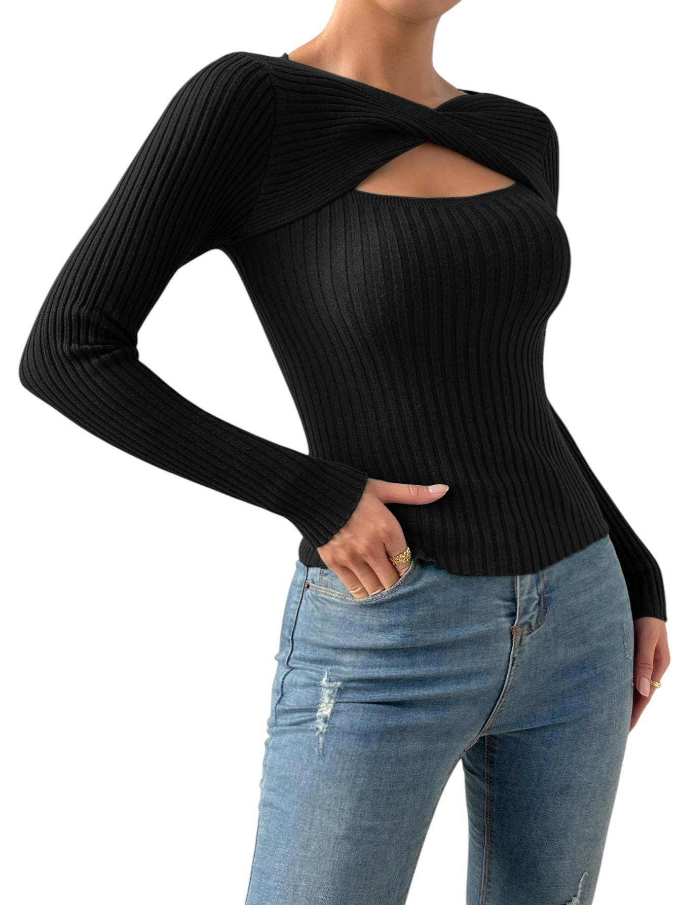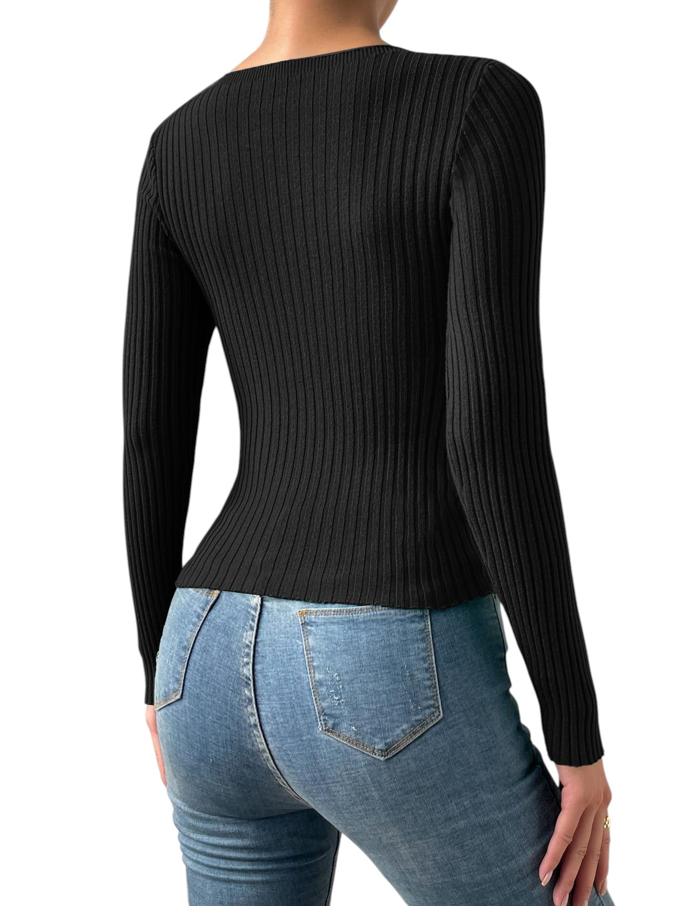 Címke nélküli, fekete, hosszú ujjú, bordázott kötött felső elöl kivágással