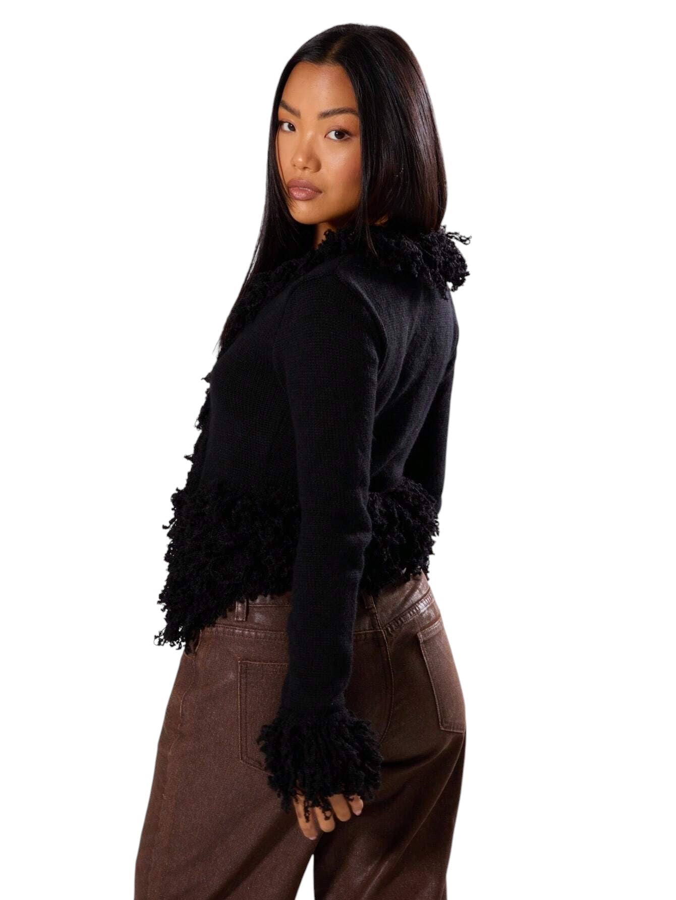Címke nélküli, fekete, nyitott elejű, hosszú ujjú boleró rojtokkal a szegélyén és a mandzsettáján