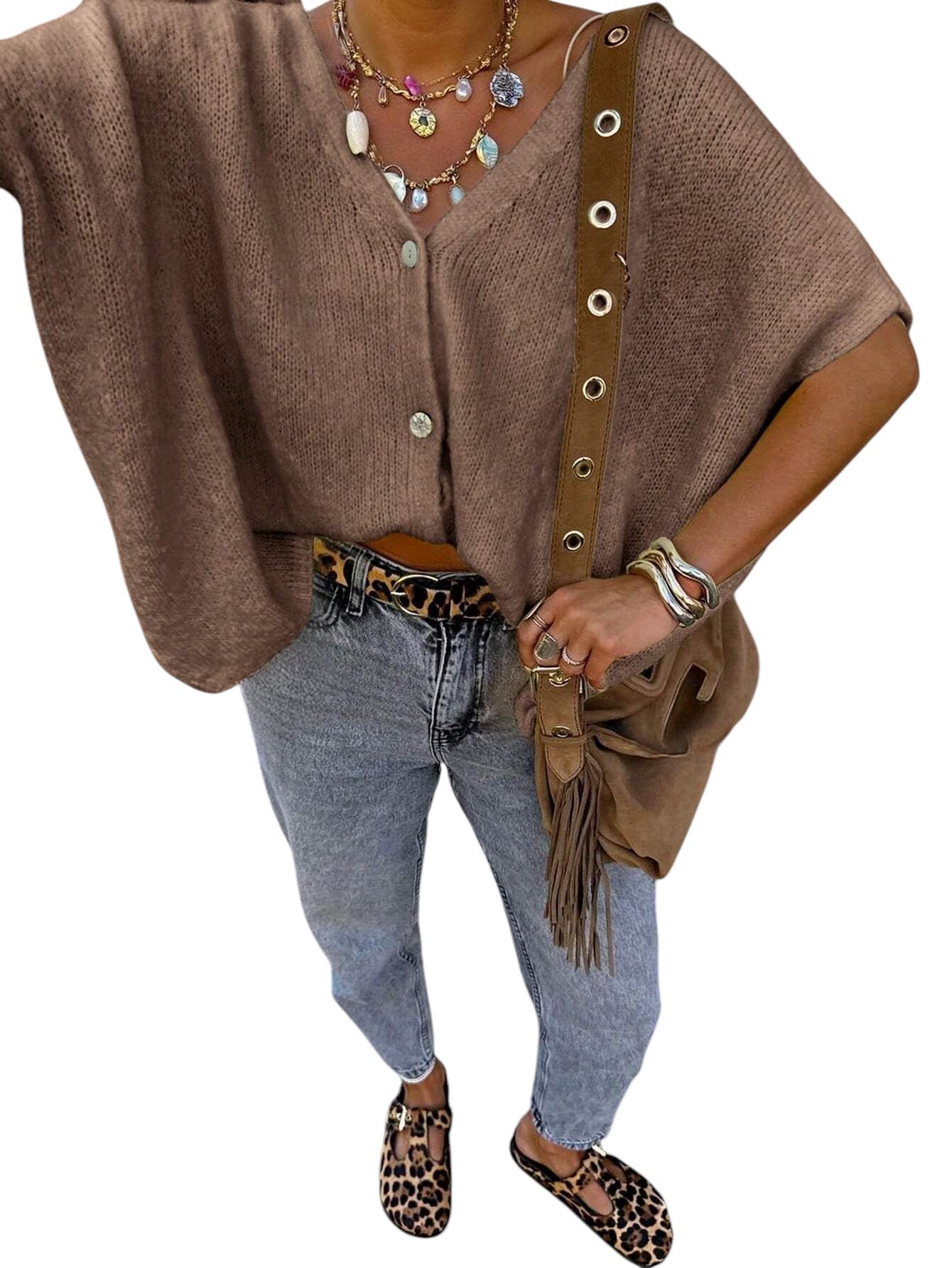 Címke nélküli, barna, V-nyakú, rövid, denevér ujjú, gombos kötött kardigán