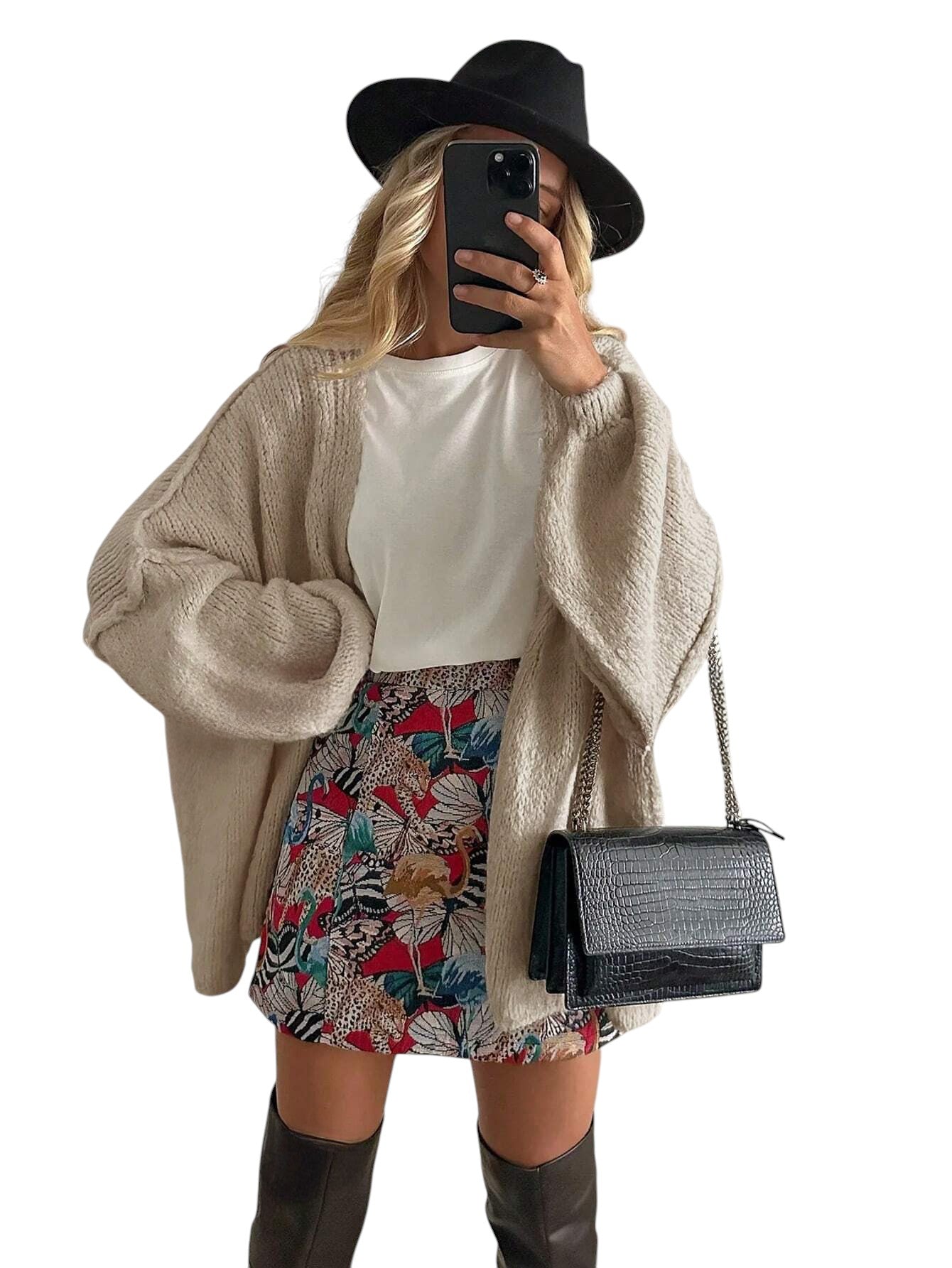 Címke nélküli, bézs, nyitott elejű, hosszú, denevér ujjú kötött kardigán