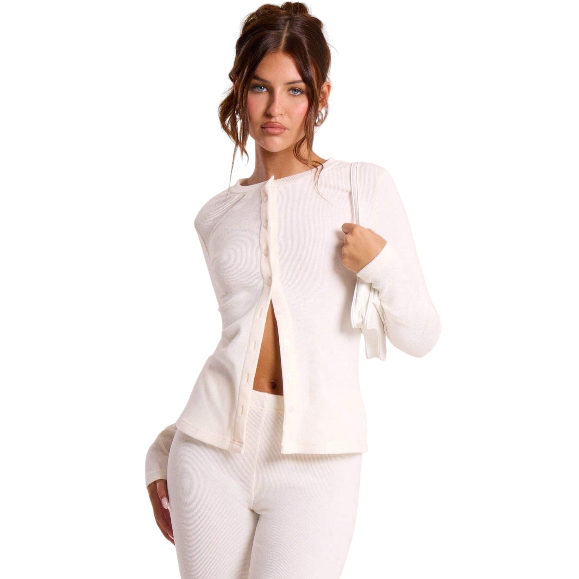 Címke nélküli, fehér, bordázott anyagú, hosszú ujjú kardigán gombokkal.