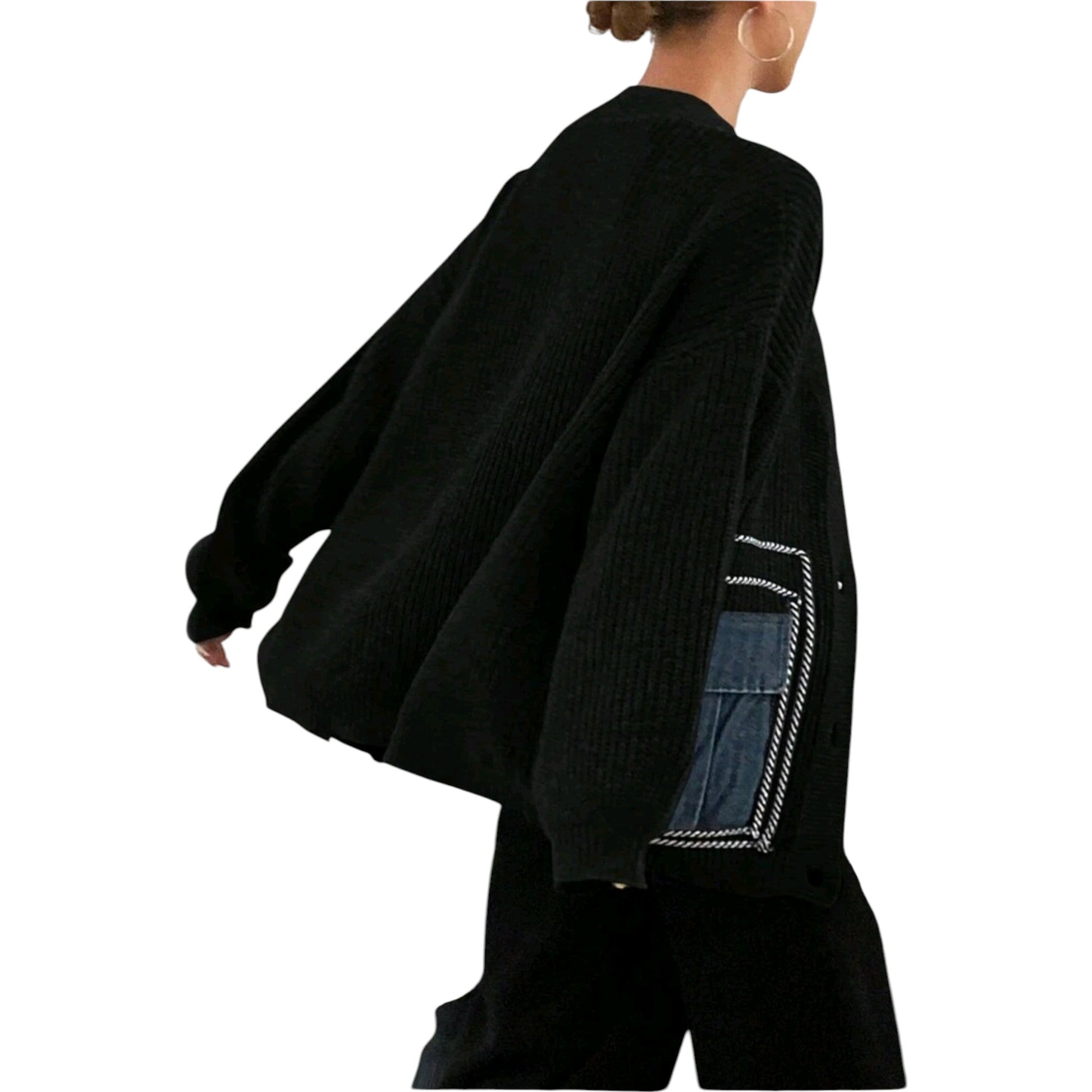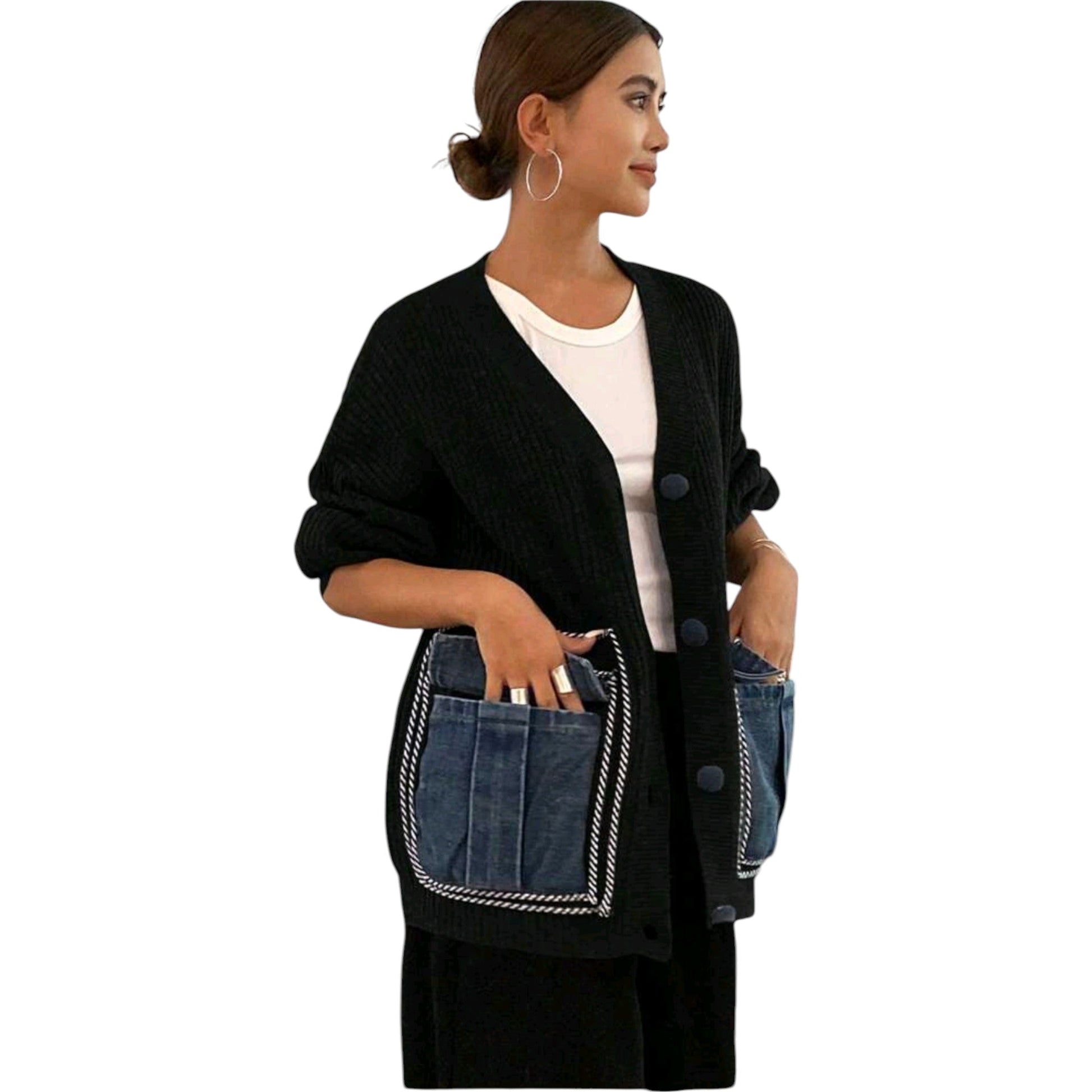 Címke nélküli, fekete, gombos, hosszú ujjú, denim zsebekkel, kötött