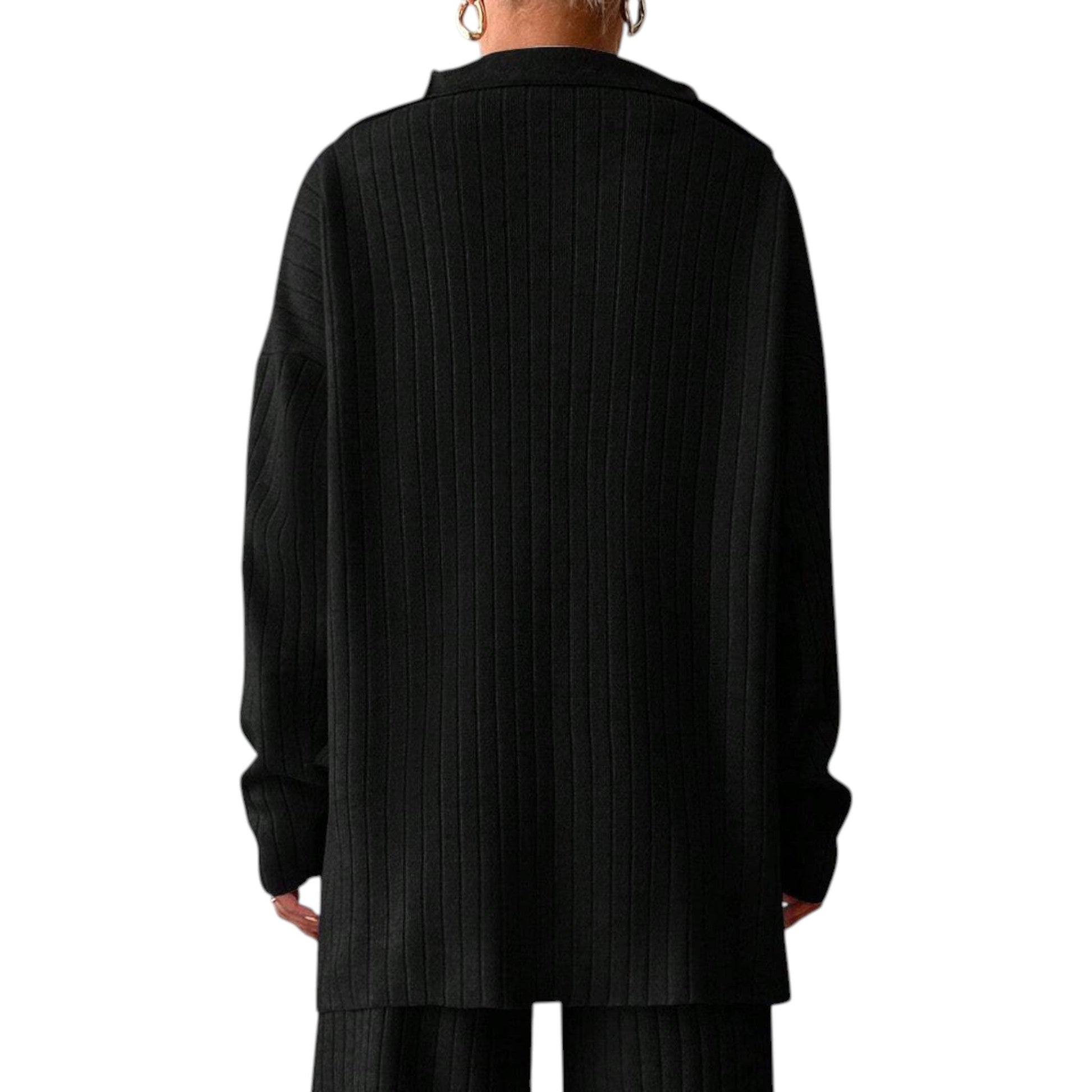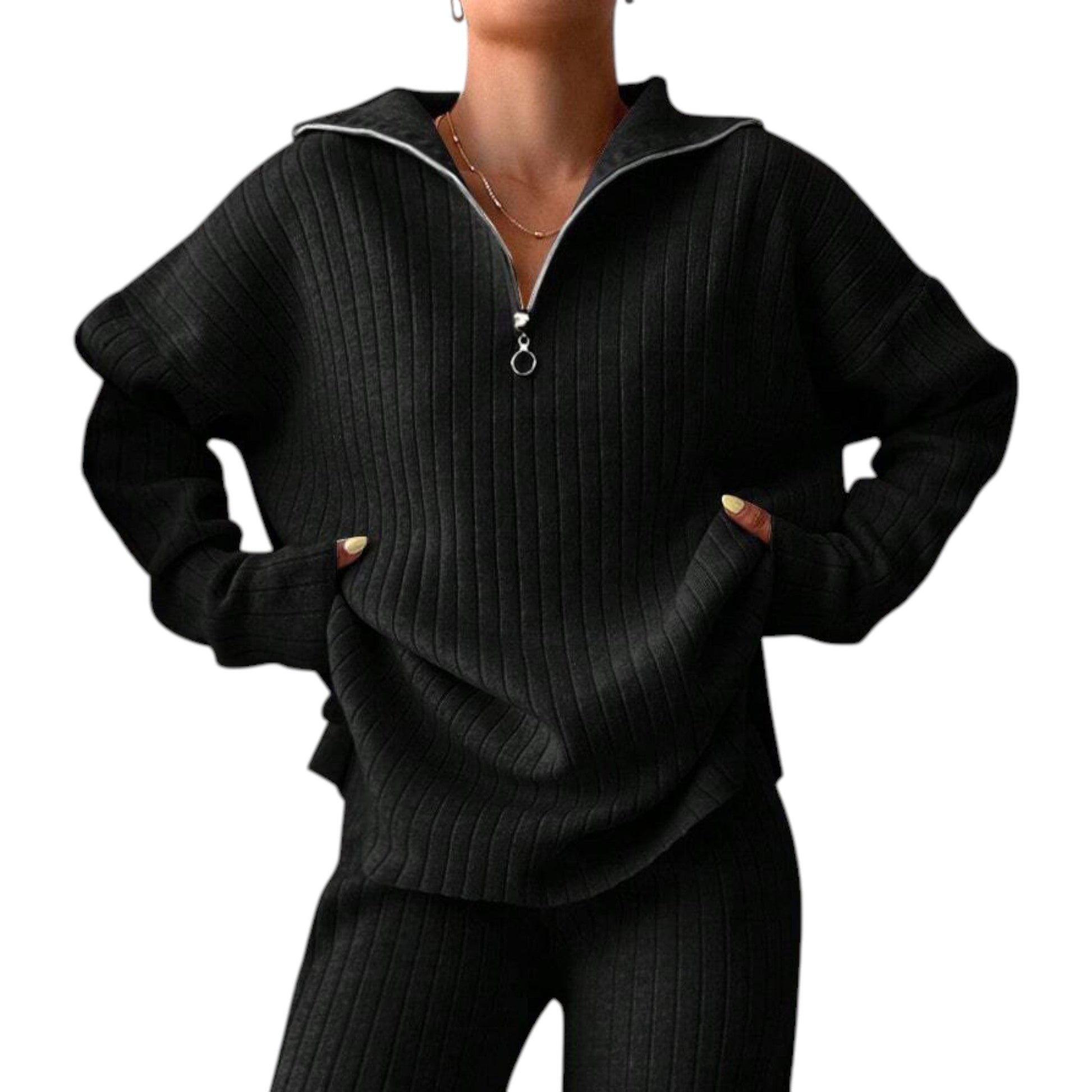 Címke nélküli, fekete, cipzáras, álló galléros, bordázott anyagú pulóver