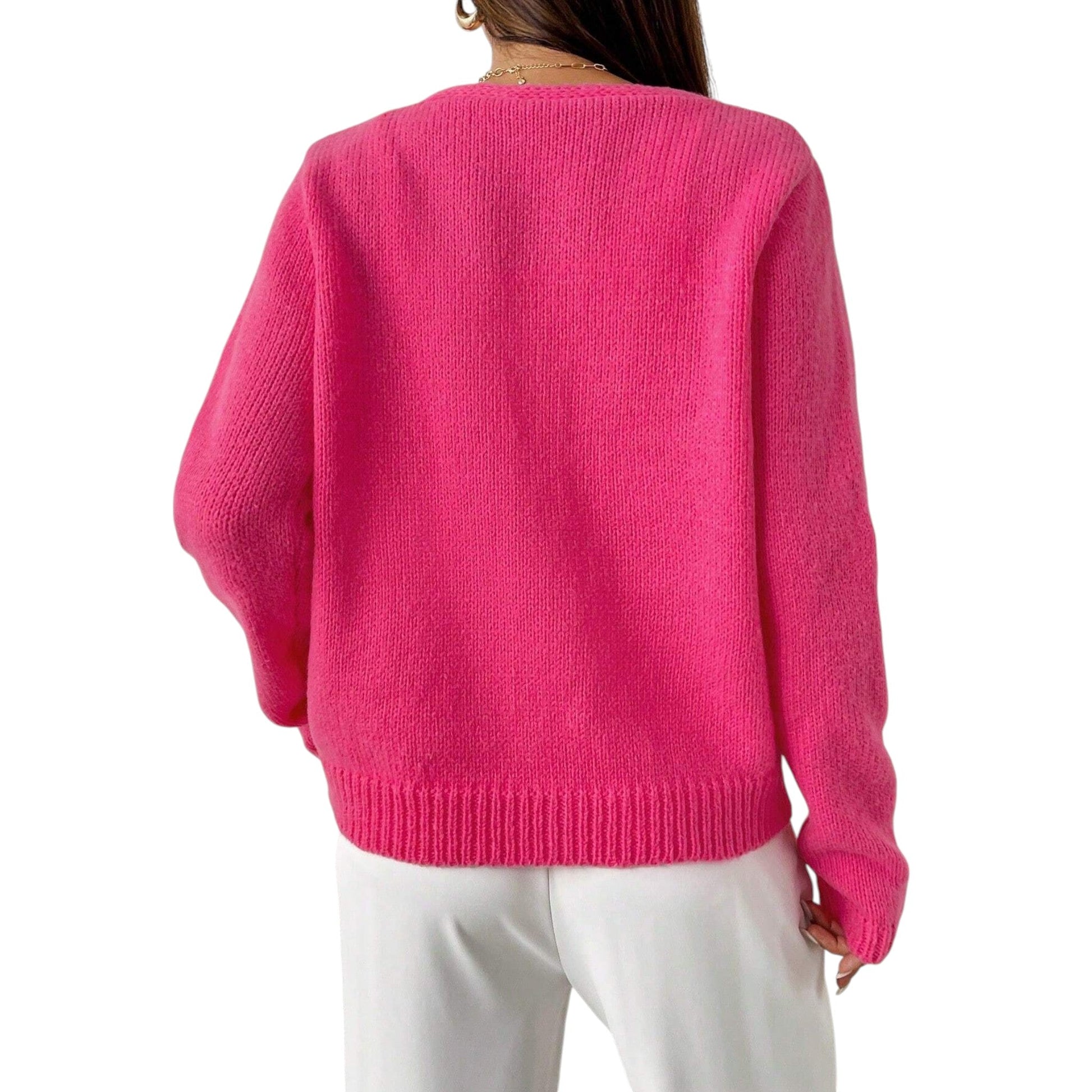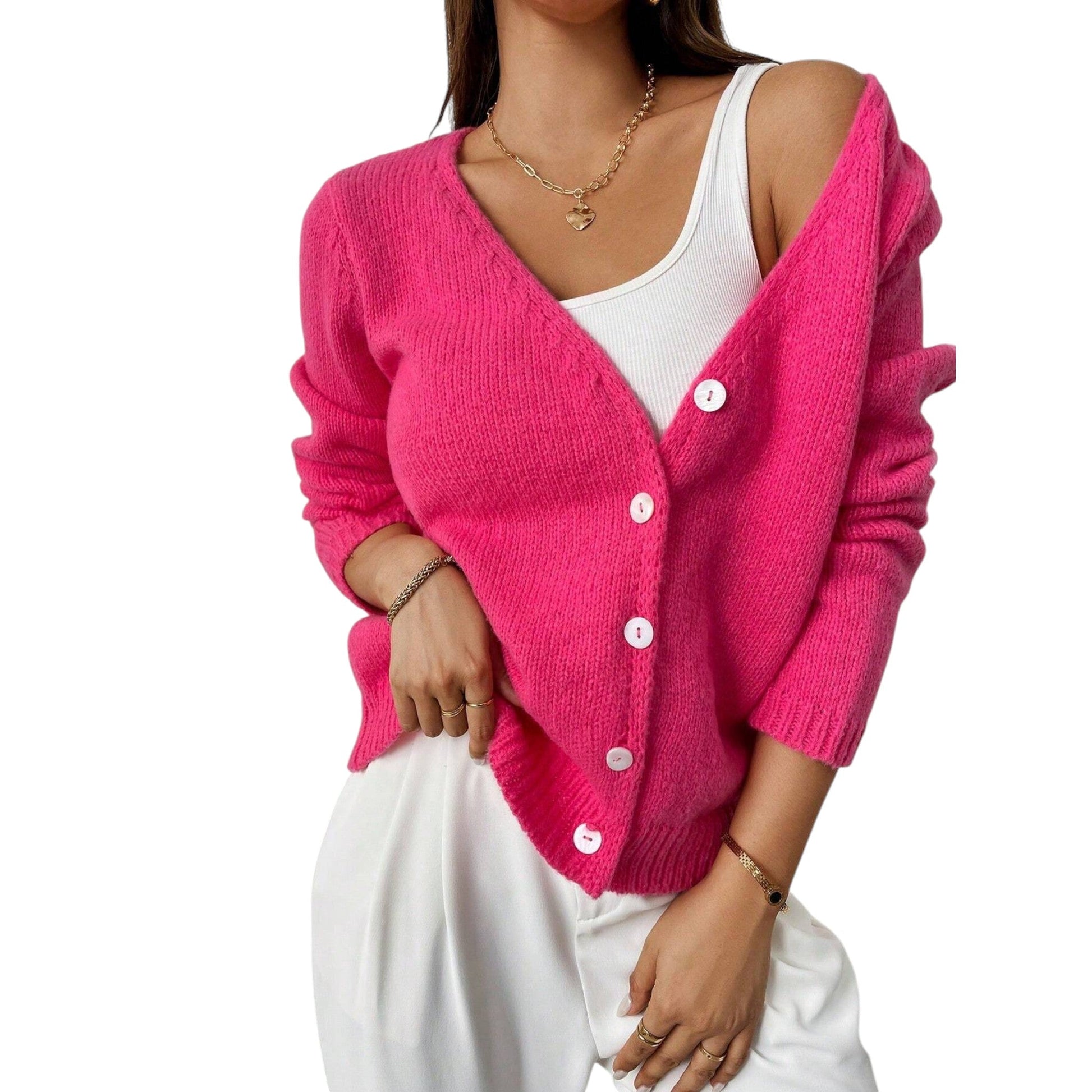 Címke nélküli, élénk rózsaszín, V-nyakú, gombos, kötött kardigán.