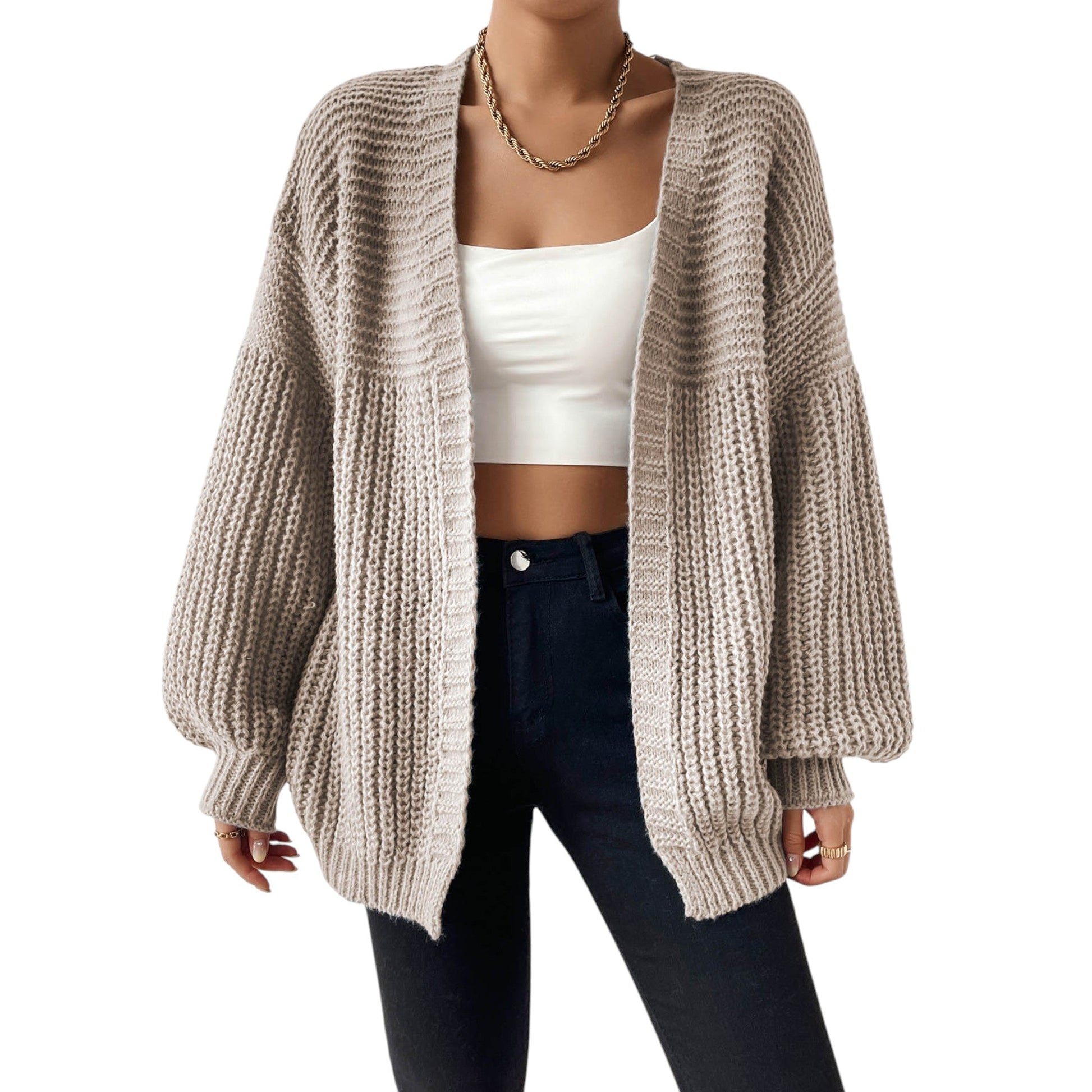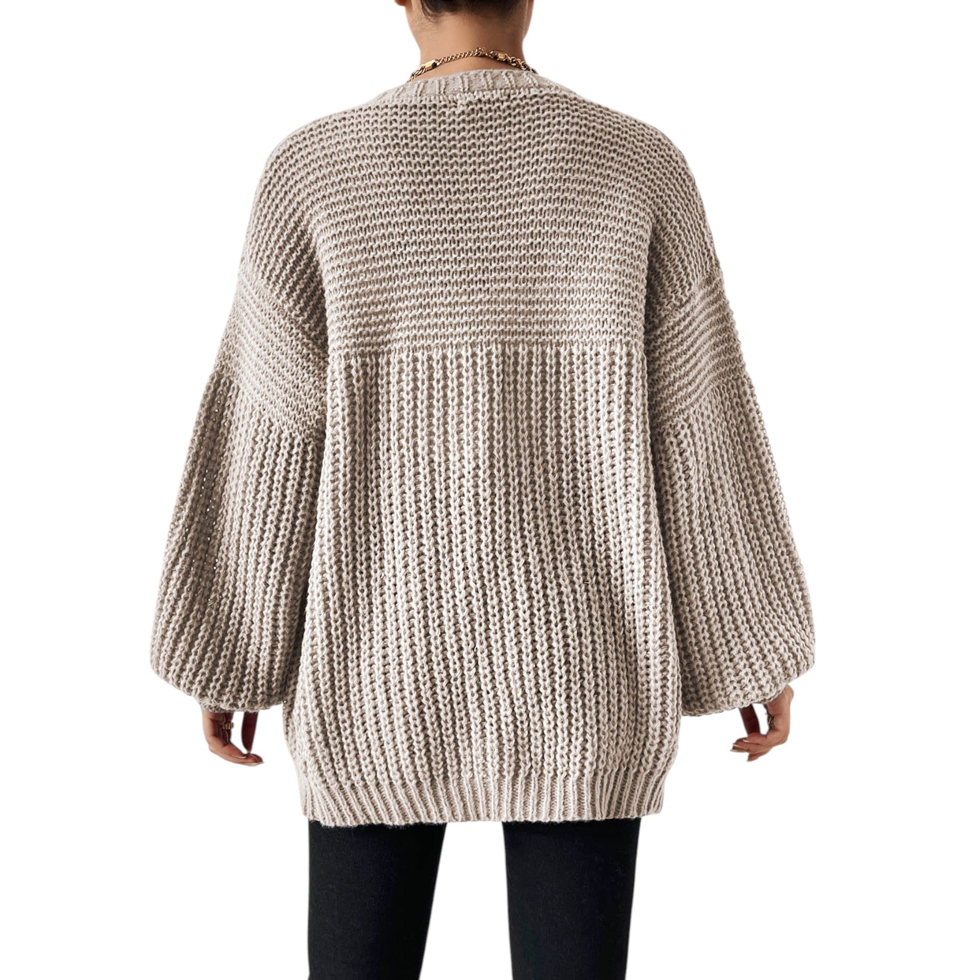 Címke nélküli, bézs, vastag bordázott kötésű, túlméretezett kardigán ejtett vállakkal és bő ujjakkal.