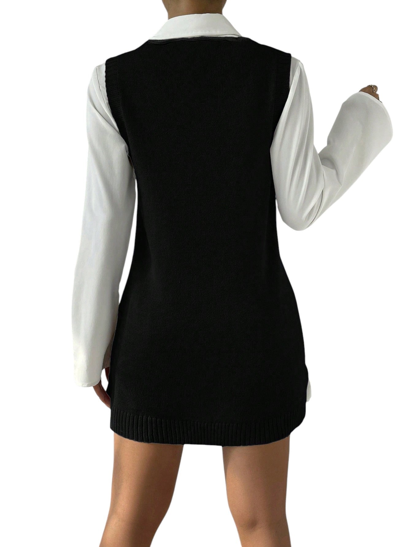 Címke nélküli, fekete, V-nyakú, ujjatlan kötött mellény ruha oldalsó sliccel.