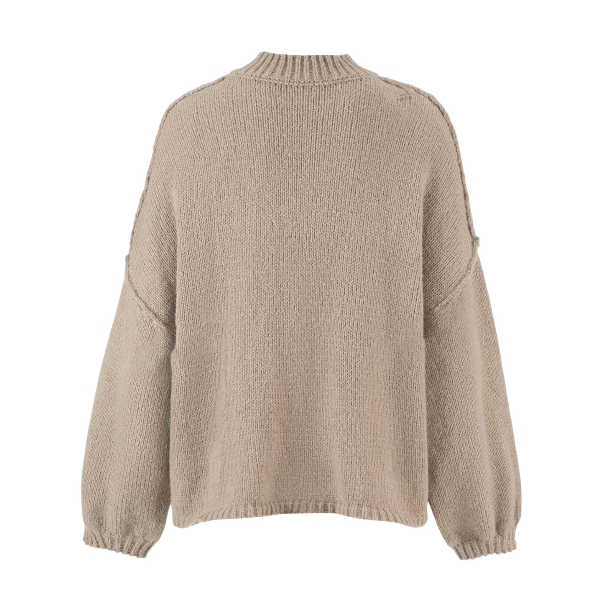 Címke nélküli, bézs, garbós nyakú, gombos kötött kardigán, ejtett vállal.