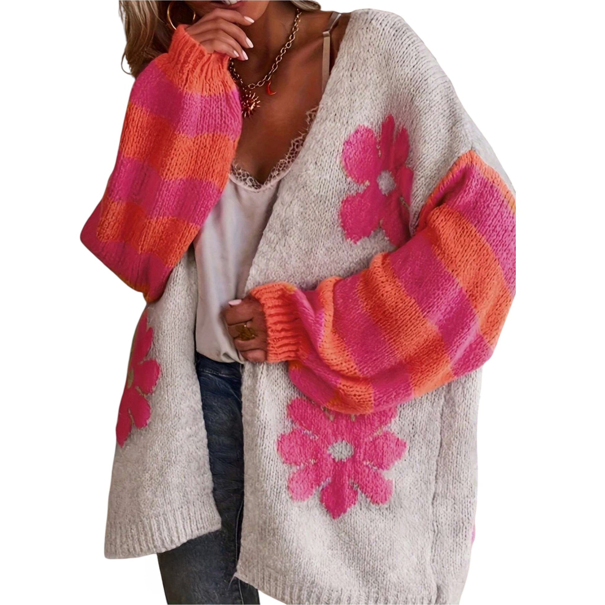 Címke nélküli, bézs alapon narancssárga és rózsaszín csíkos ujjú, nagy virágmintás, nyitott elejű, kötött kardigán.