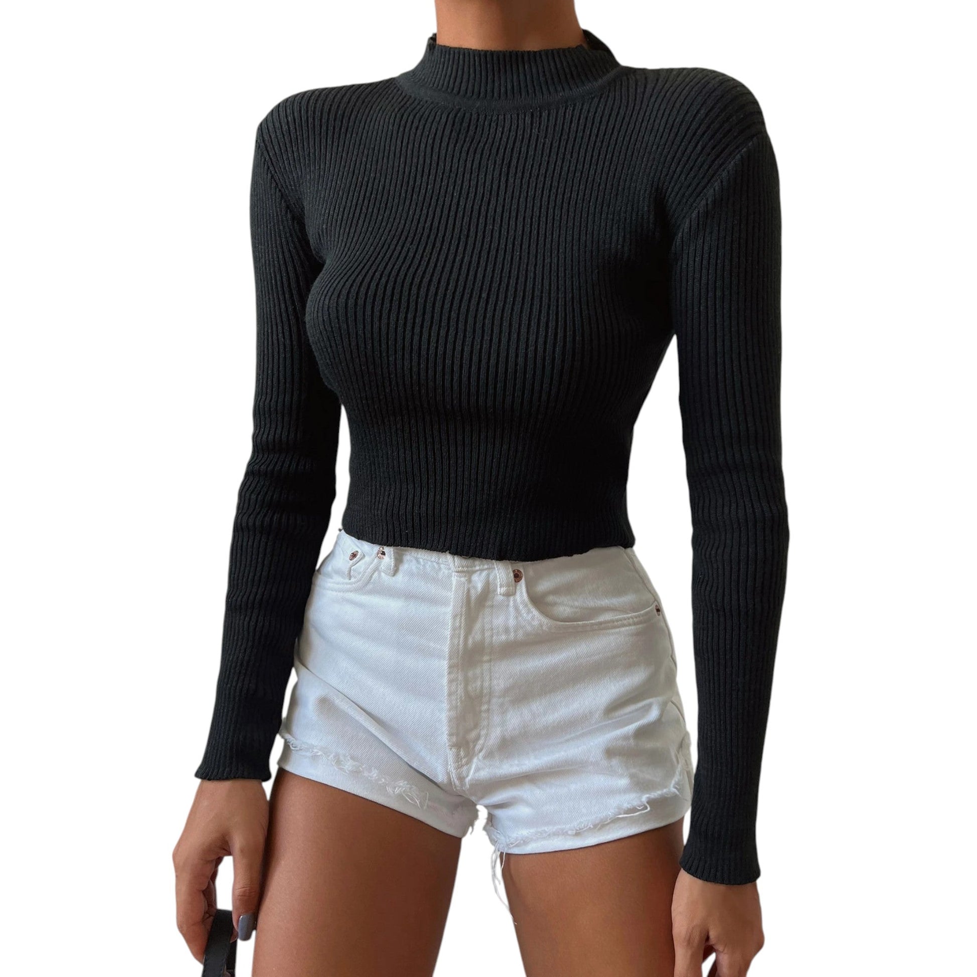 Címke nélküli, fekete, magas nyakú, hosszú ujjú, bordázott kötött felső, crop szabással.
