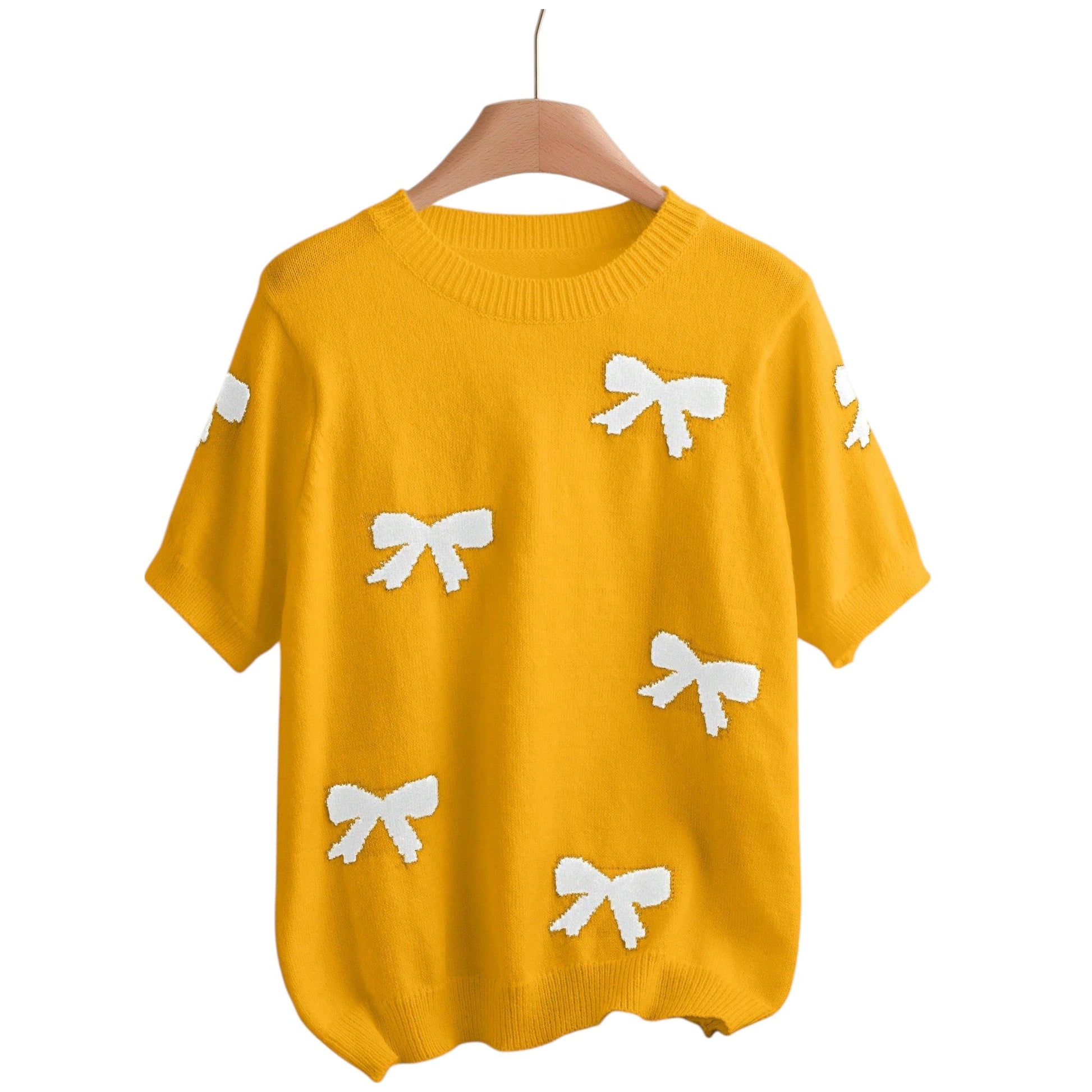 Címke nélküli, sárga, kötött felső, rövid ujjú, kerek nyakú, elöl és a karokon fehér masni mintával.